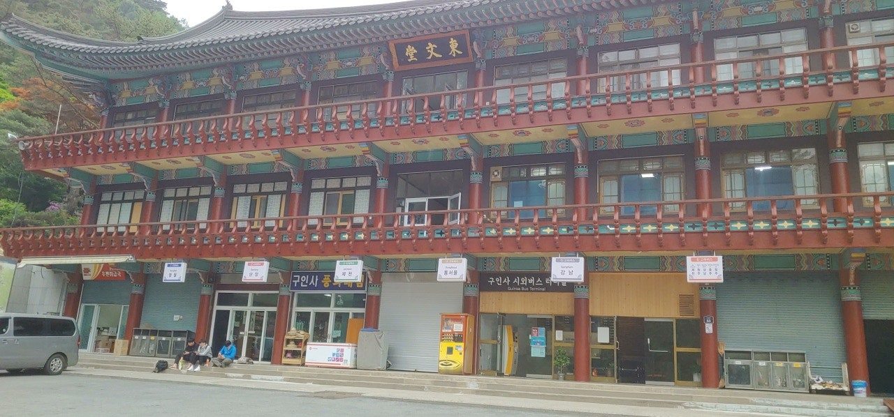 구인사 입구에는 전국 각처로 연결되는 직행버스 터미널이 있고, 우체국도 있었다. 주차장에서는 구인사를 찾는 불교신자와 관광객을 위해 미니버스를 구인사 입구까지 두 시간 간격으로 운행하고 있다. 이곳 입구에서부터는 걸어서 올라야 한다. 구인사 정상까지는 경사진 지형으로 천천히 걸어야 한다. 건강한 사람은 문제가 없지만 노인들에겐 쉽지 않은 길이다.