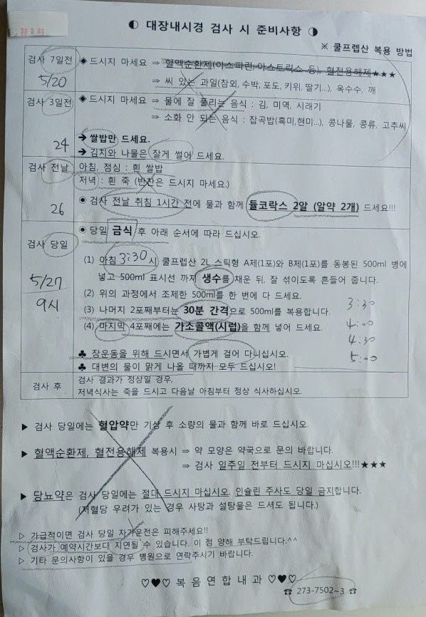 그런데 위와 장 내시경이 문제이다. 약물을 마시고 뱃속의 음식을 모두 배설시킬 일이 심란하다. 내 몸의 건강 상태를 점검하는 것이니 당연히 해야 할 일을, 한 번은 약 마시기 싫어 포기했고, 한 번은 코로나 때문에 미루었다. 장 검사 약물 마시고 내시경 하는 것이 여간 고역이 아니어서 머뭇거리는 것이다. 검진 일을 예약하고 검사 전 주의해야 할 메모지를 받았다. 7일 전, 3일 전, 1일 전, 검사 당일 준비사항을 보는 순간부터 긴장이 시작되었다.
