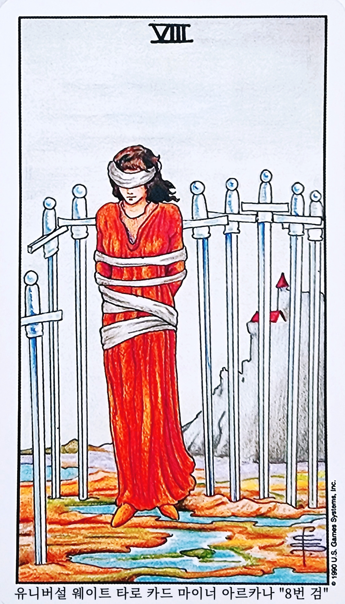 “미래 자리에서 나온 ‘8번 검’ 카드로 보아, 괴로움이 내면을 지배하는 상황에 처하게 될 것으로 예측됩니다.