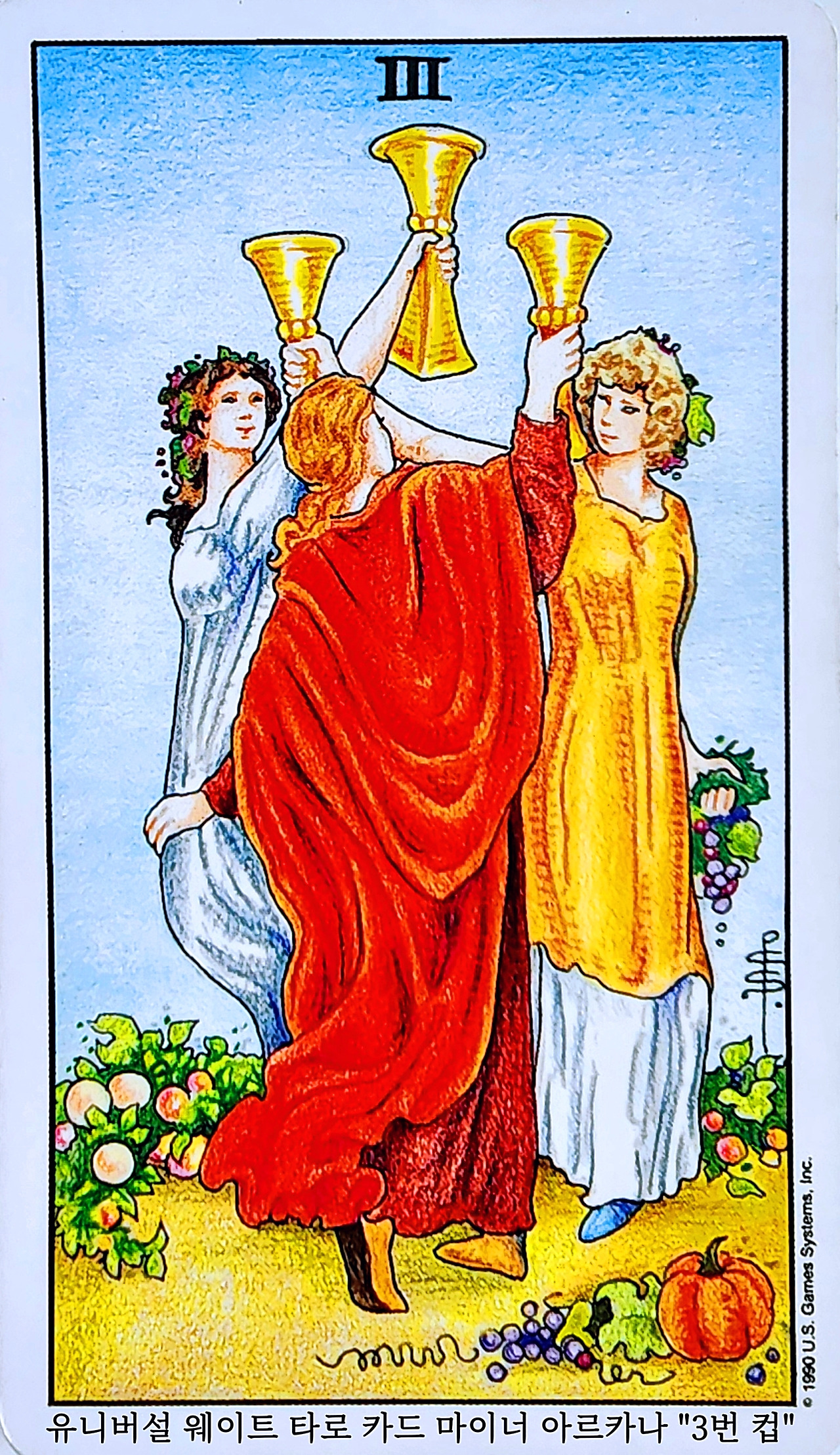 1. 과거 자리에는 3번 컵(THREE of CUPS) 카드가 나왔다.