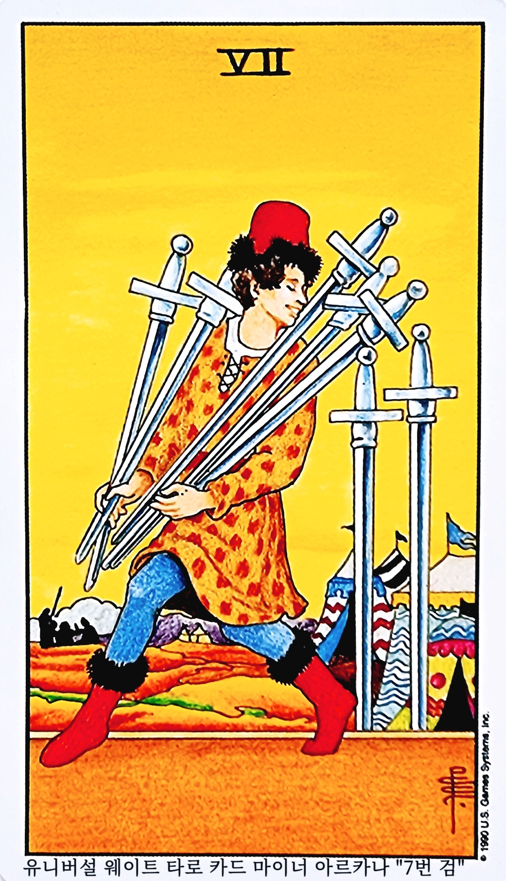 2. 현재 자리에는 7번 검(SEVEN of SWORDS) 카드가 나왔다.