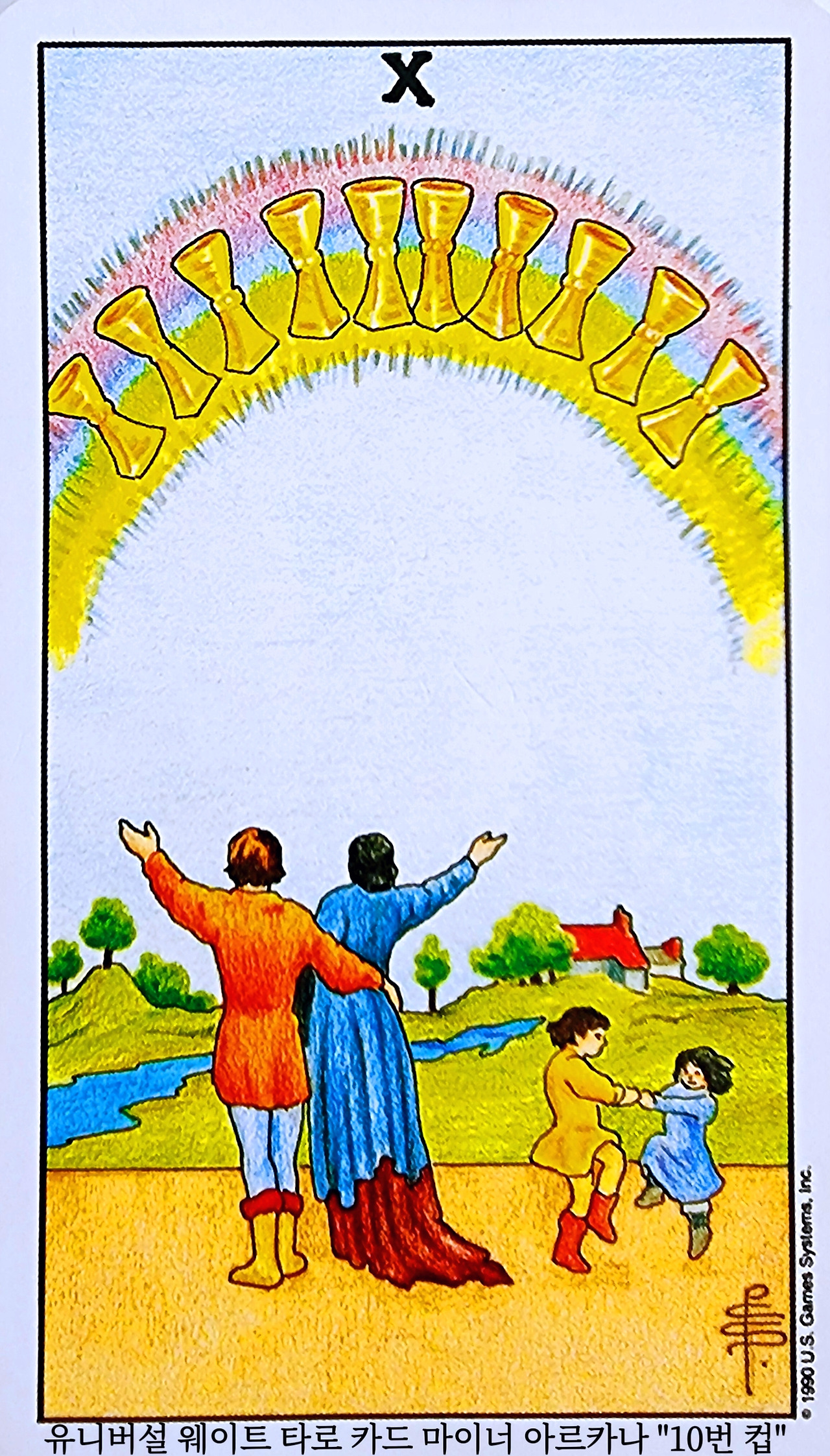 10번 컵 카드는 행복한 결말과 마음의 만족을 의미한다. 이는 내담자의 질문인 이혼 후 상황이 어떻게 흘러갈지에 대한 답변이기도 하다.