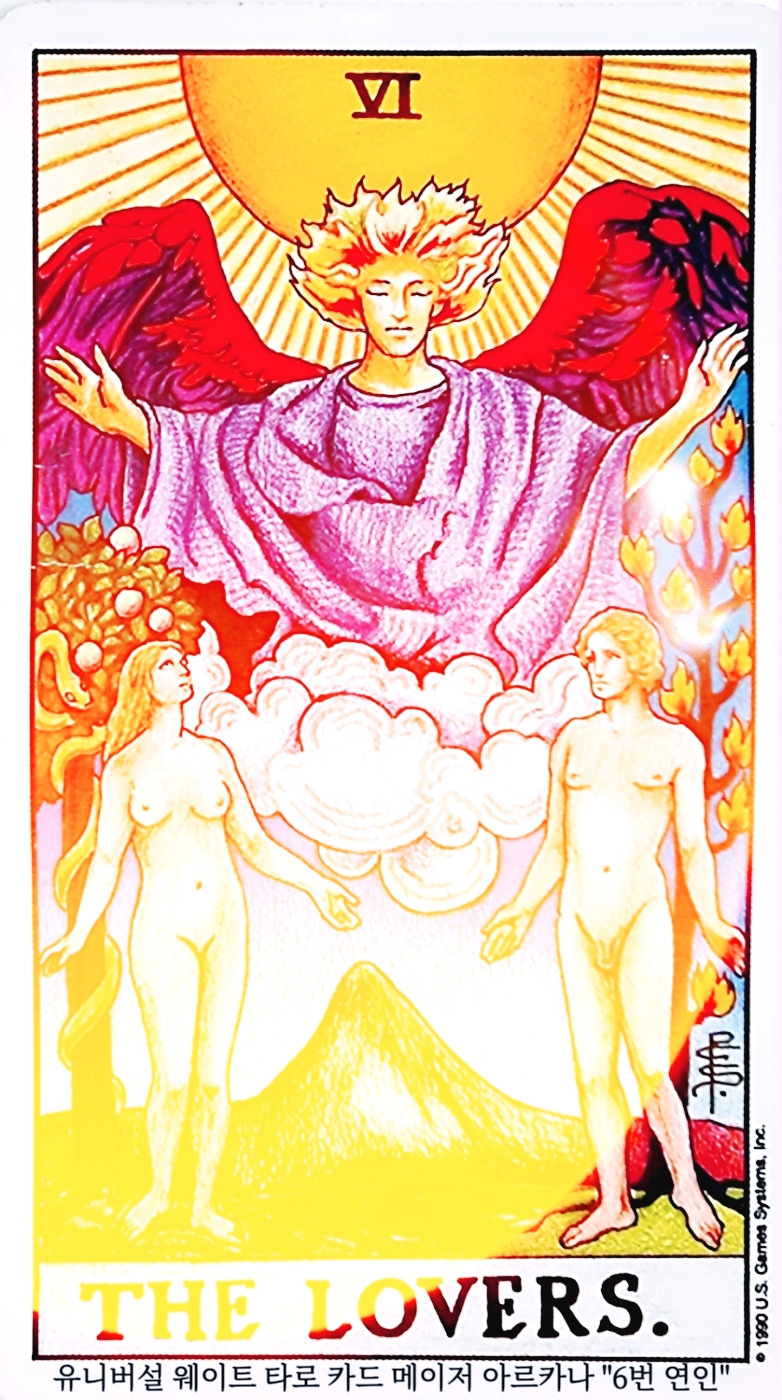 6번 연인 카드는 사랑, 조화, 그리고 중요한 선택의 순간을 의미한다.