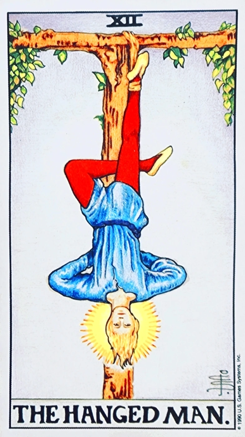 ☆ 12번 매달린 남자 카드는 전환점이라기보다는 인생의 균형을 되찾기 위해 새로운 시각으로 바라보아야 하는 시기이다. 그러므로 상황을 섣불리 판단하지 않는 때에 해당한다.