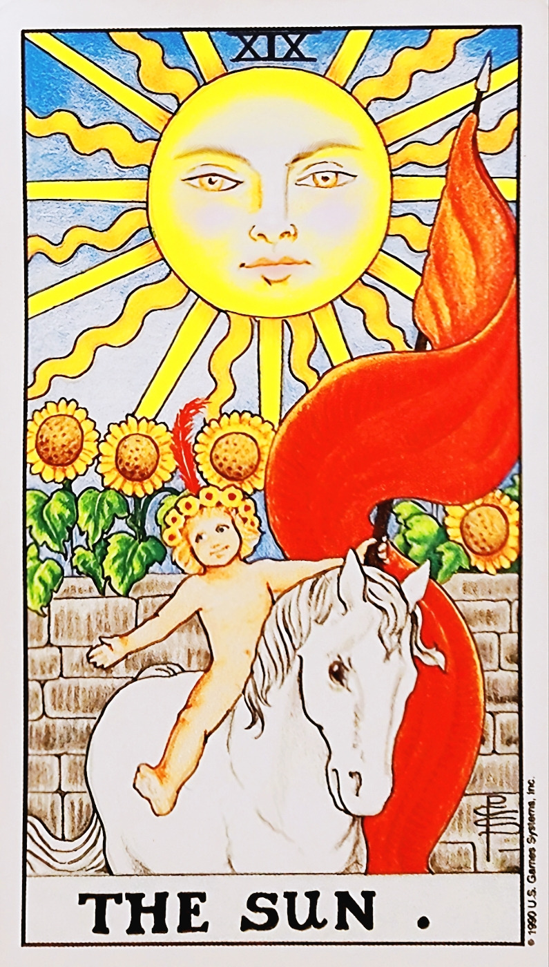 이처럼 한 주의 밝음과 목표에 대한 확실한 행복감을 전해 줄 에너지에 어울리는 타로 카드는 바로 19번 태양(THE SUN)이다. 말 그대로, 우리의 삶을 환하게 비추는 태양이다.