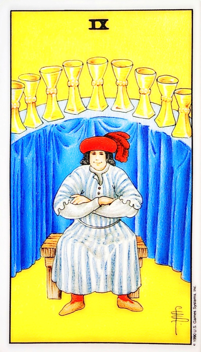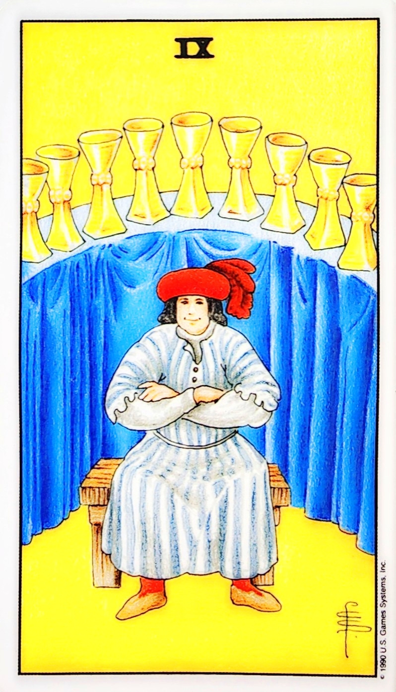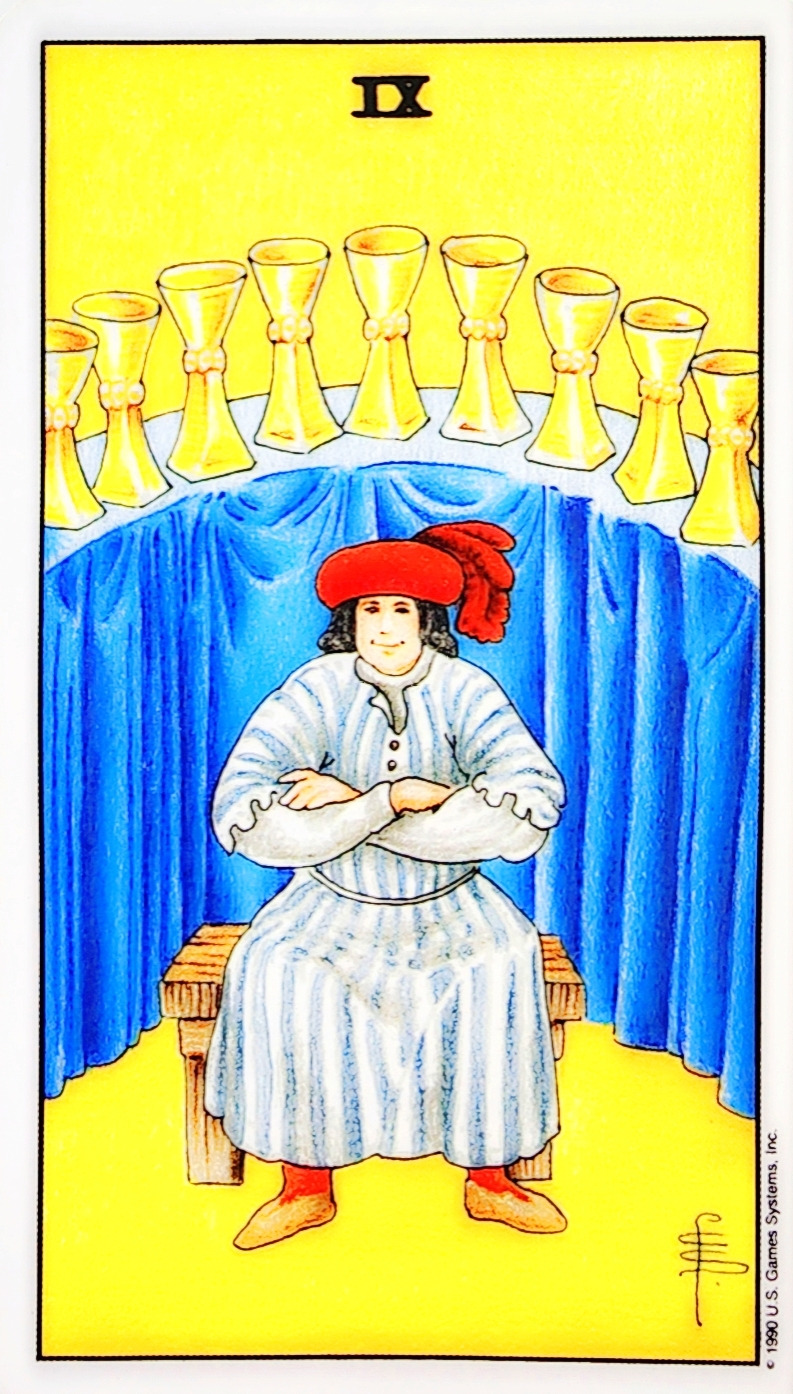 금전운에서 성취감을 느끼는 것을 나타낸다. 그동안 계획했던 목표에 도달하여 재정적 만족감을 느끼는 시기다. 경제적 안정을 만끽하는 상황으로, 그만큼 마음의 여유와 물리적인 여유를 두루 갖춘 상태이다. 이러한 안정감은, 그동안의 많은 노력 끝에 얻어낸 결실이라는 것을 9개의 컵을 통해 알 수 있다.