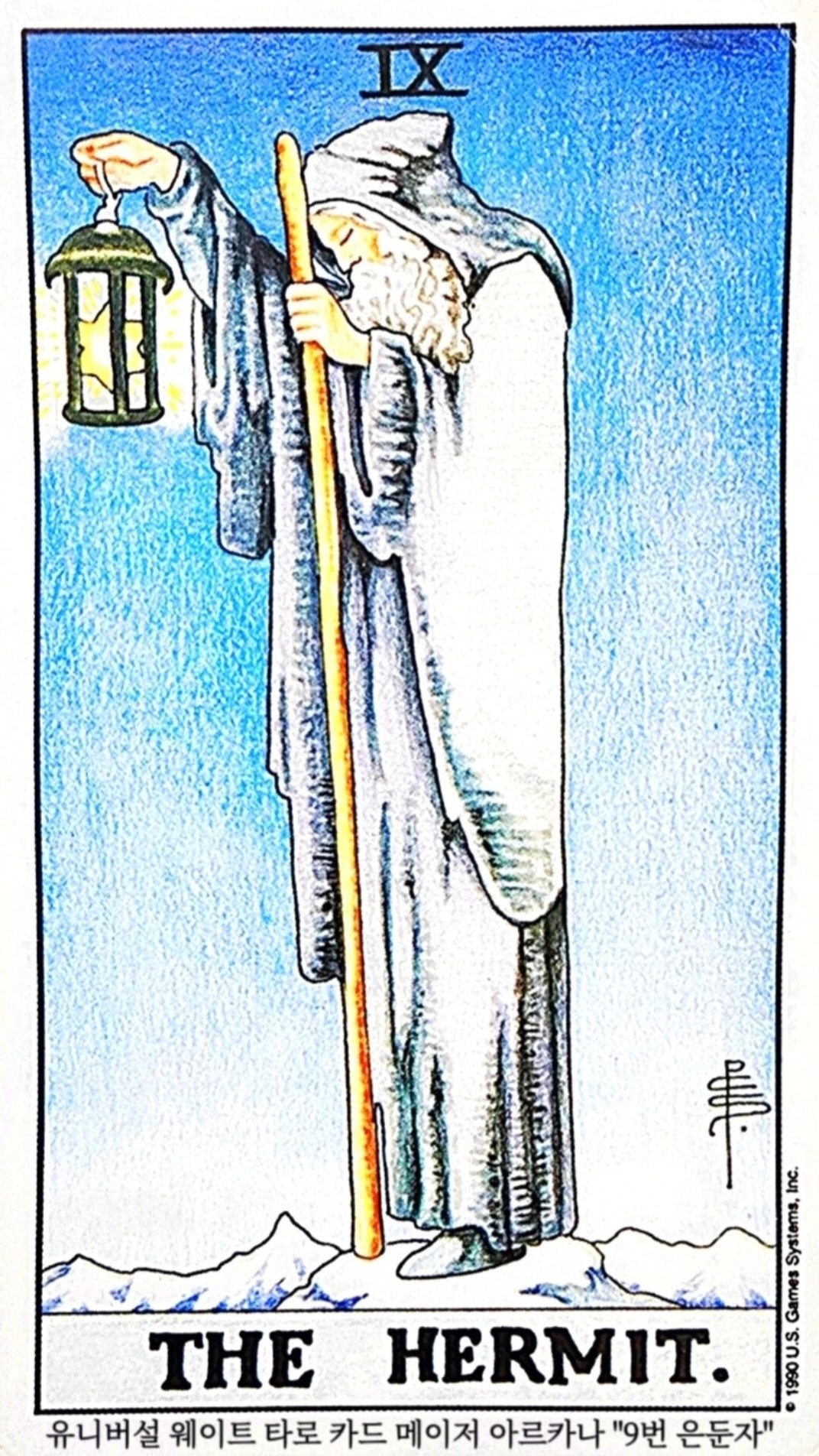 9번 은둔자 카드가 전하는 메시지는 내면을 깊이 돌아보기입니다. 현재와 미래의 화려한 삶을 위해 달려가는 것만이 전부는 아닐 것입니다.