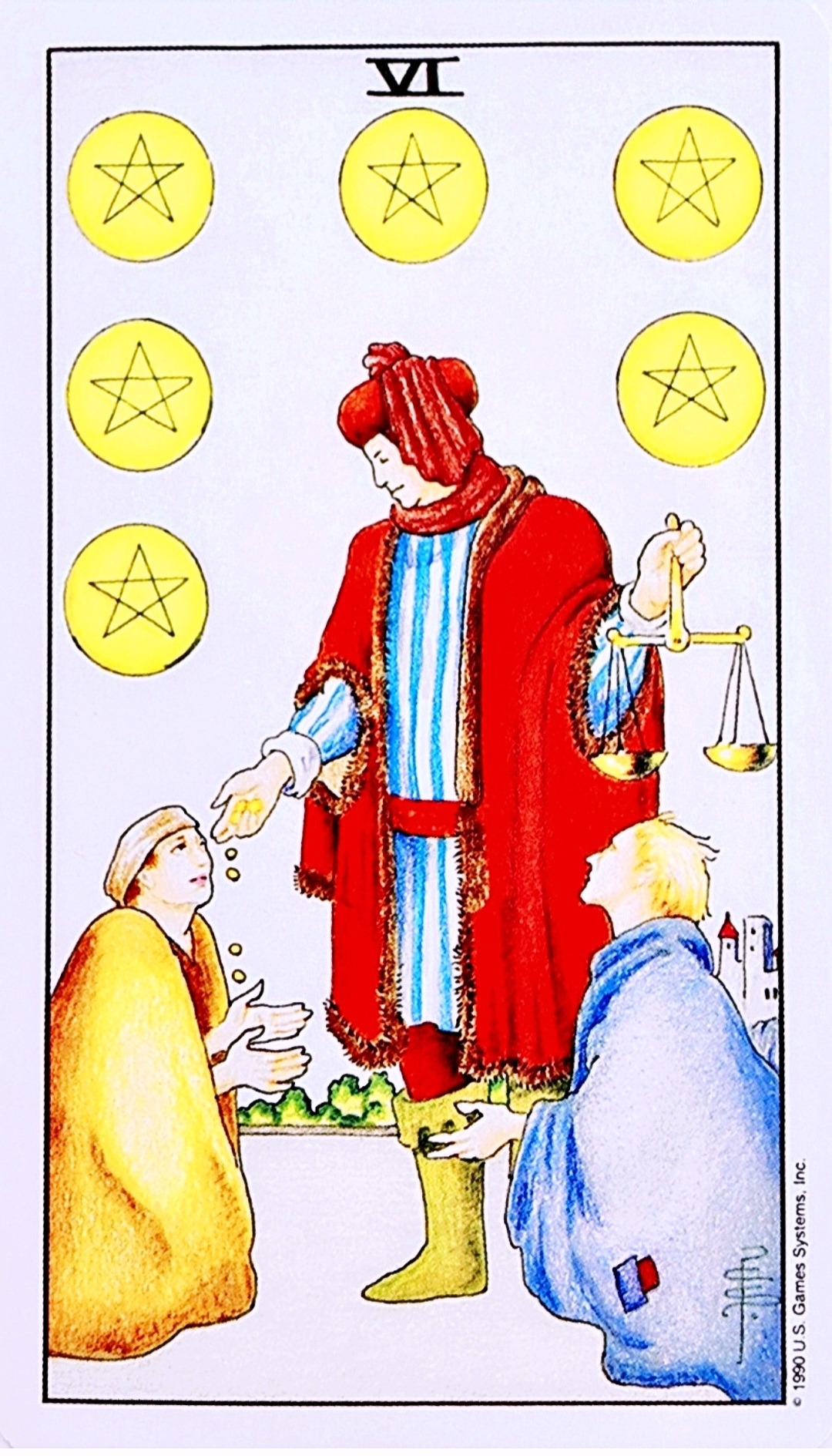 타로전환점 운세를 볼 때, 6번 동전 (SIX of PENTACLES) 카드가 인간관계운 자리, 이동운 자리, 금전운 자리에 나왔을 때, 각 자리에 해당하는 해석을 통해 전환점여부를 파악할 수 있다.