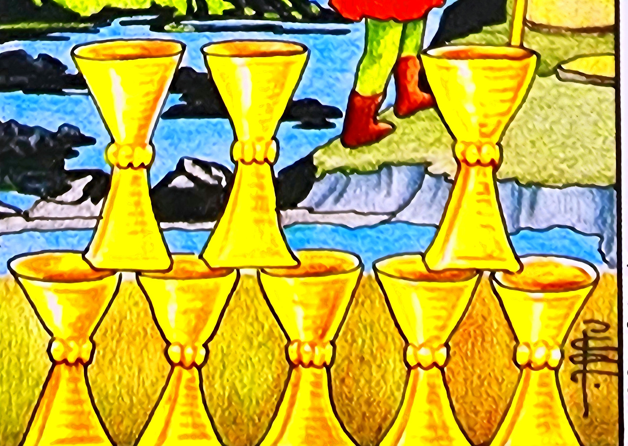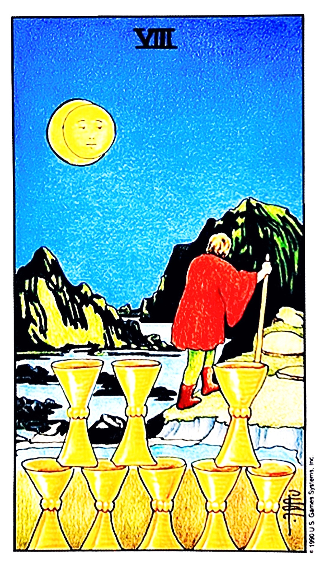 그 사이에서 오랫동안 머물렀던 감정들이 흔들린다. 익숙하고 편안했지만 더 이상 나를 채워주지 않는 지금까지의 흐름들... 성취한 8개의 황금컵을 바라보지만 여전히 공허함으로 가득하다.