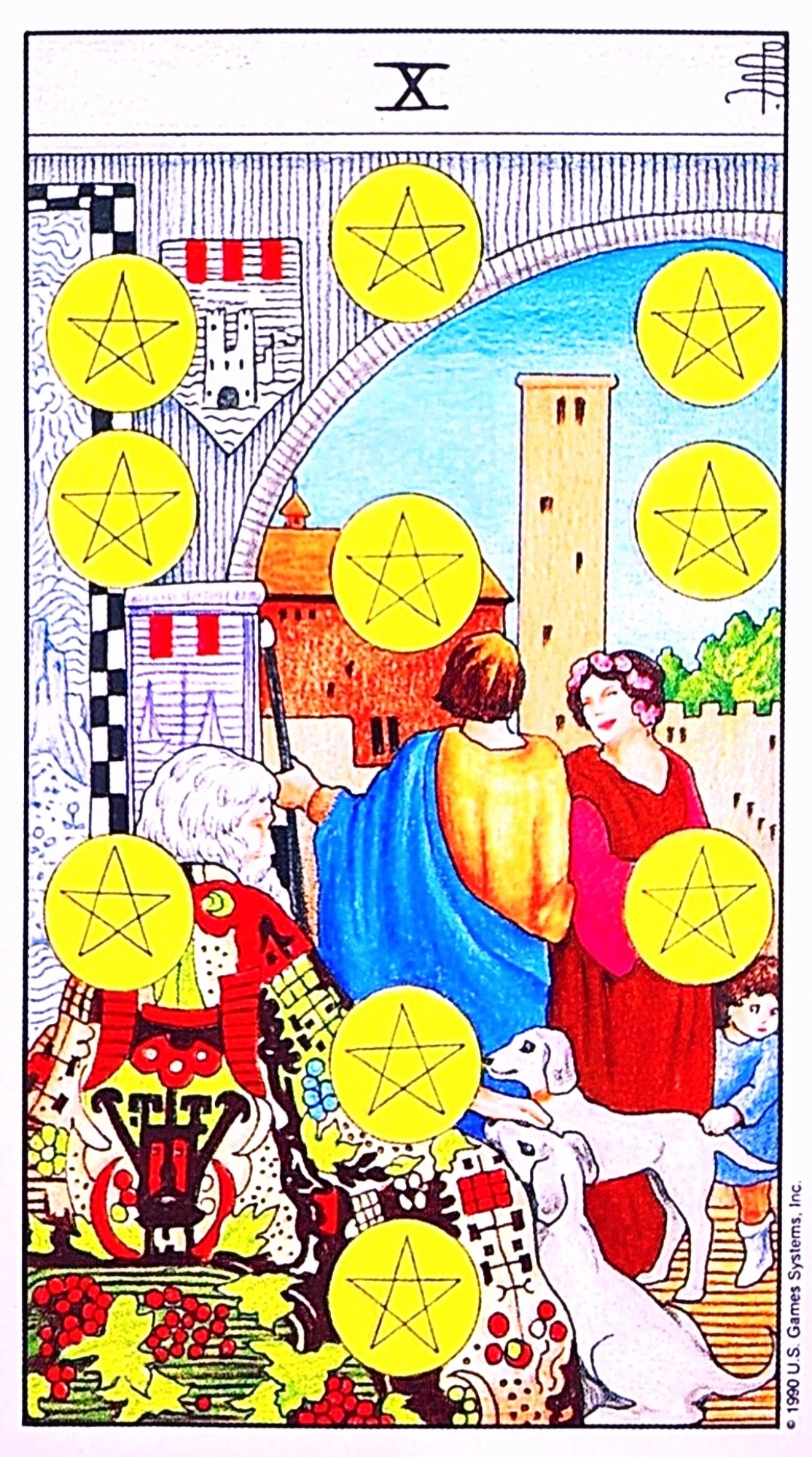 타로 전환점 운세를 볼 때, 10번 동전 (TEN of PENTACLES) 카드가 인간관계운 자리, 이동운 자리, 금전운 자리에 나왔을 때, 각 자리에 해당하는 해석을 통해 전환점여부를 파악할 수 있다.