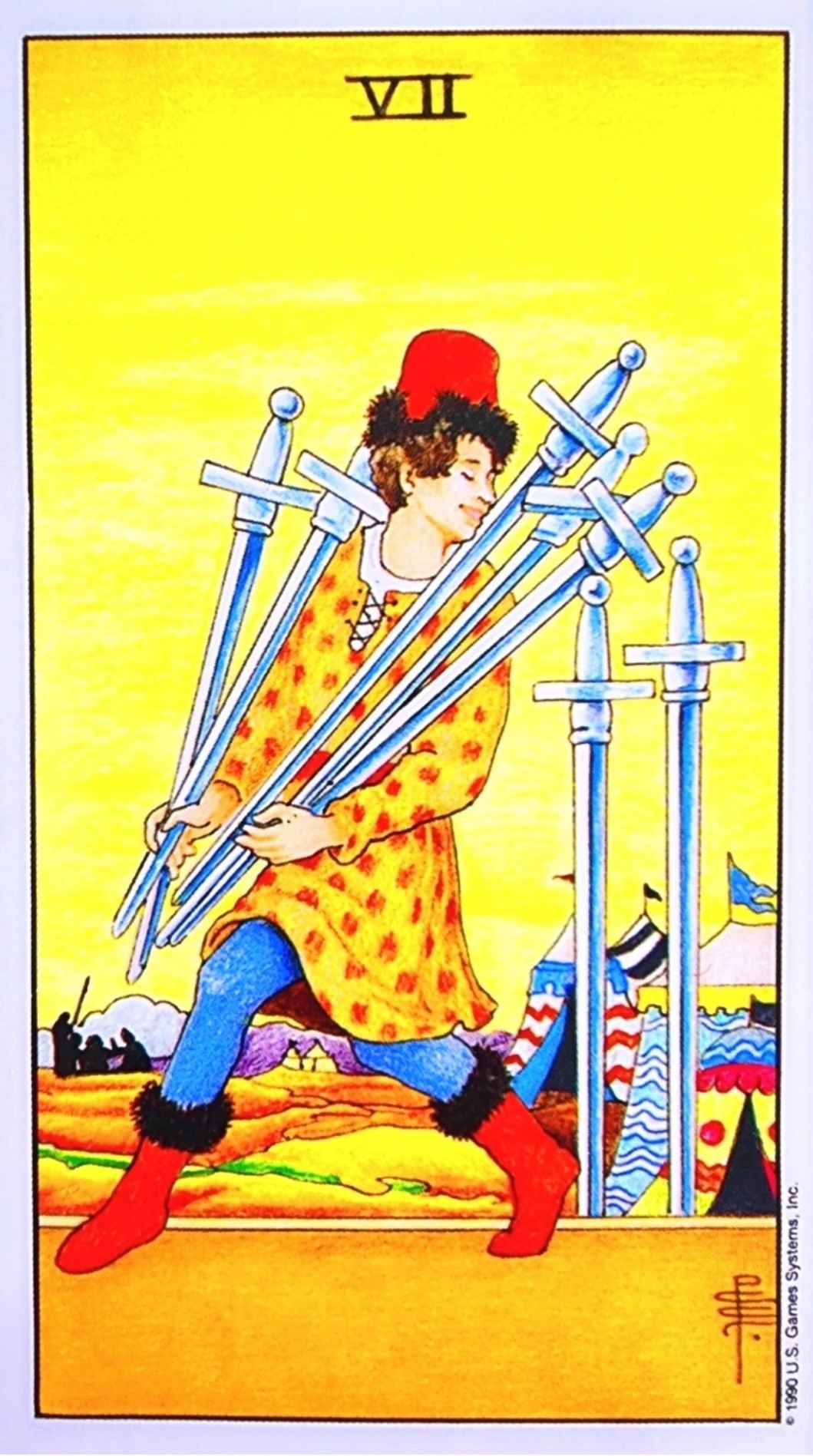 타로 전환점 운세를 볼 때, 7번 검 (SEVEN of SWORDS) 카드가 인간관계운 자리, 이동운 자리, 금전운 자리에 나왔을 때, 각 자리에 해당하는 해석을 통해 전환점여부를 파악할 수 있다.