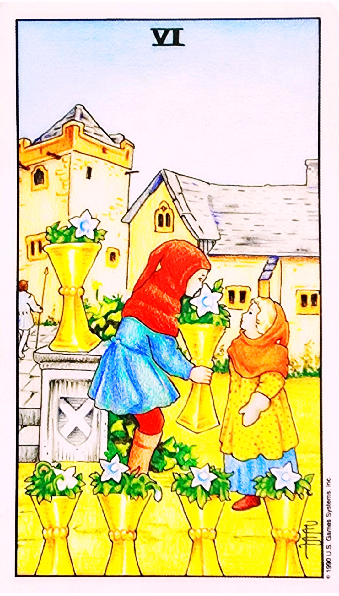 6번 컵은 과거를 회상하는 에너지가 담긴 카드로, 어린 시절의 기억, 지나온 날들의 향기, 과거 중 우리가 잊고 있던 순간순간의 소소한 추억을 불러오는 카드다. 오늘은 토요일, 손에 쥔 카드를 바라보기에 여유롭고, 평일에 비해 비교적 평화로운 분위기에서 카드를 만끽할 수 있는 날이다. 나는 문득 오래 전의 풍경들이 마음속에 잔잔히 스며들고 있음을 느꼈다.