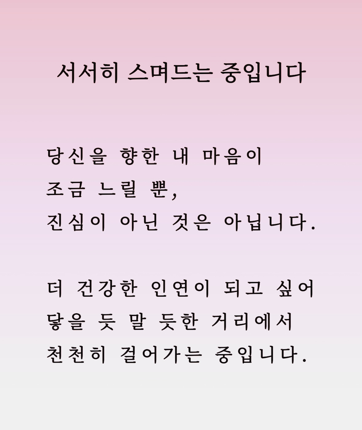 그렇기에 나는 상대의 첫인상이 좋고, 나와 결이 잘 맞고, 서로의 에너지가 맞닿아 있다 하더라도, 인연의 진전에 있어서는 서두르지 않는 편이다. 그렇다고 오래 뜸을 들이는 것이 해답은 아니다. 그저 물 흐르듯 자연스럽게 마음이 가는 대로 행동이 이어지는 대로 그 흐름을 따른다. 이런 흐름을 따라갈 때 나도 상대도 부담 없이 천천히 서로를 알아가며 진심으로 마주하게 된다.