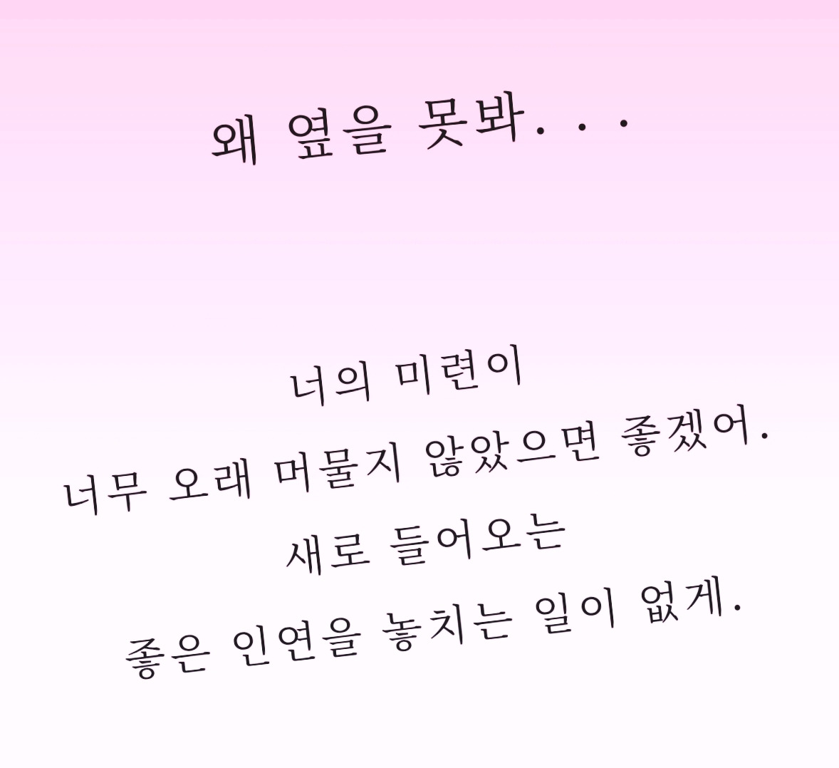 누군가 내 발목을 붙잡고 놓지 않는 것이 아니라, 스스로를 지나간 것에 묶어 두었을 때 불편함에도 불구하고 "나는 편안하다" 느끼는 것이다. 일종의 착각일 수 있다. 이미 끝난 것임에도, 놓지 못하는 마음은 희망이 아니라 미련일 뿐이다.