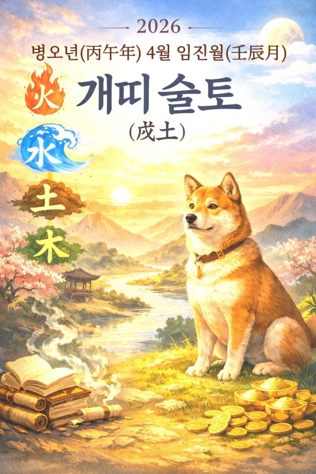 2026년 병오년 화(火) 기운 위에, 4월 임진월의 수(水)와 토(土)가 더해집니다. 개띠 술토(戌土)에게는 화(火) 기운이 힘을 공급해 주고 진토(土)가 중심을 단단히 잡아주는 흐름입니다. 하지만 수(水) 기운이 변화를 일으켜 살짝 긴장감을 줄 수 있습니다. 강화-긴장-안정이라는 흐름을 잘 이해하고 움직이면, 개띠 술토에게는 긍정적인 전환과 안정이 함께 찾아오는 한 달이 될 것입니다.