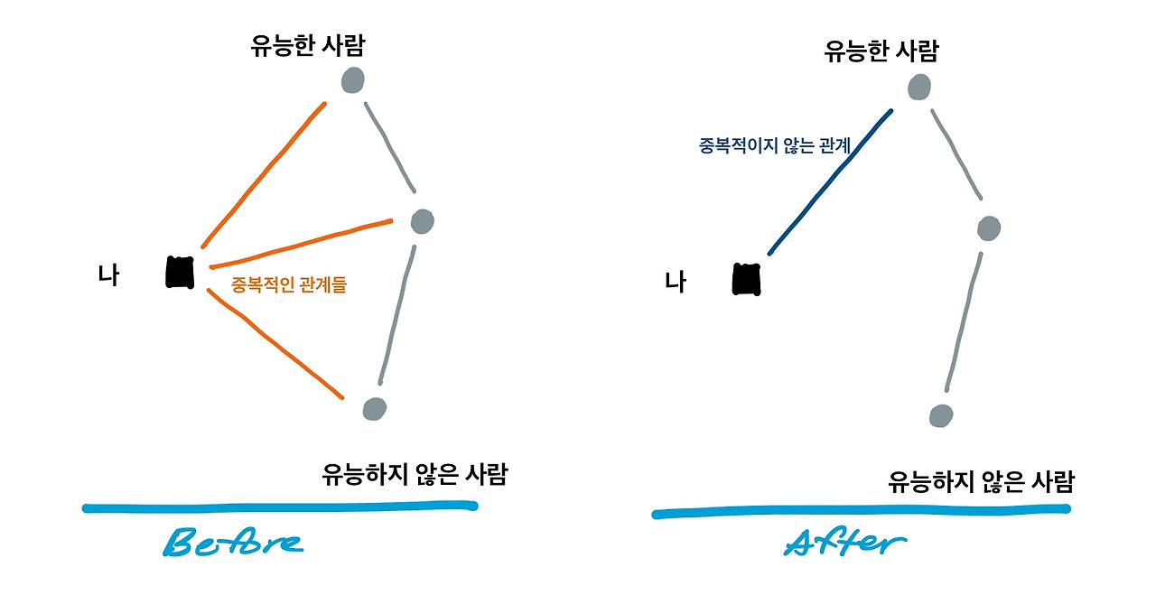 그렇다면 이 세 명과의 관계를 모두 유지해야 할까? 그렇기에는 소요되는 비용이 너무 크다. 옛 동료와의 관계를 유지하느라 새로운 관계 형성이 어렵기 때문이다. 그럼 세 명 모두와의 관계를 끊어야 할까? 그건 평판을 위해서도 좋지 않지만, 평판에 신경 쓰지 않는다고 하더라도 가까운 사람을 멀리 두기는 힘든 일이다.