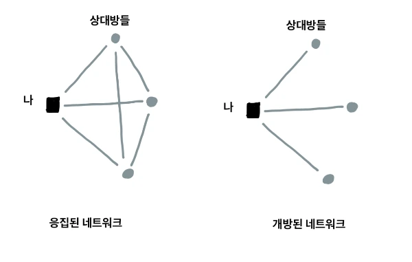 그림 2의 왼쪽을 보자. 당신은 현재 세 명과의 관계를 통해 응집된 네트워크를 만들었다. 이 세 명은 서로 너무 잘 알고 있기 때문에, 모두 비슷한 정보와 생각을 가지고 있을 것이다. 그렇기 때문에 응집된 네트워크는 불필요한 중복이 많이 생겨난다.