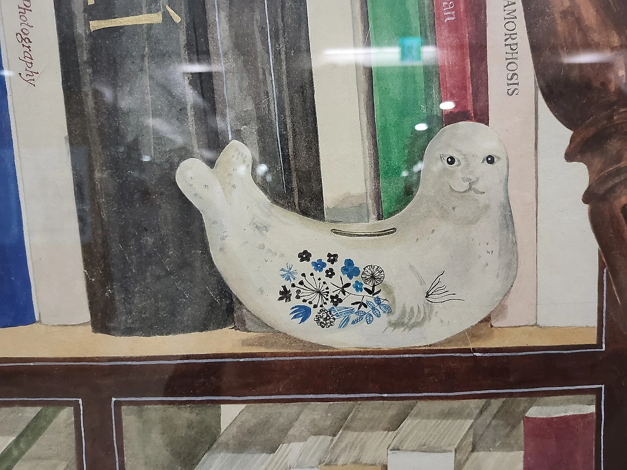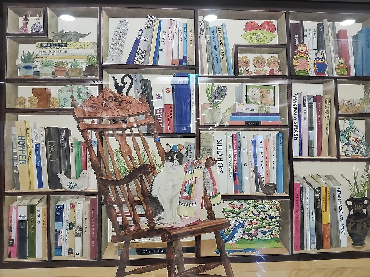 커다란 서재에 흔들의자와 사랑하는 고양이가 그려져 있다. 선반에 아끼는 화분도 보인다. 식물도 백파이프도, 물개 모양 장식품도 있다. 마트로슈카. 자전거를 타고 다니는 기타 맨. 강아지퍼즐.