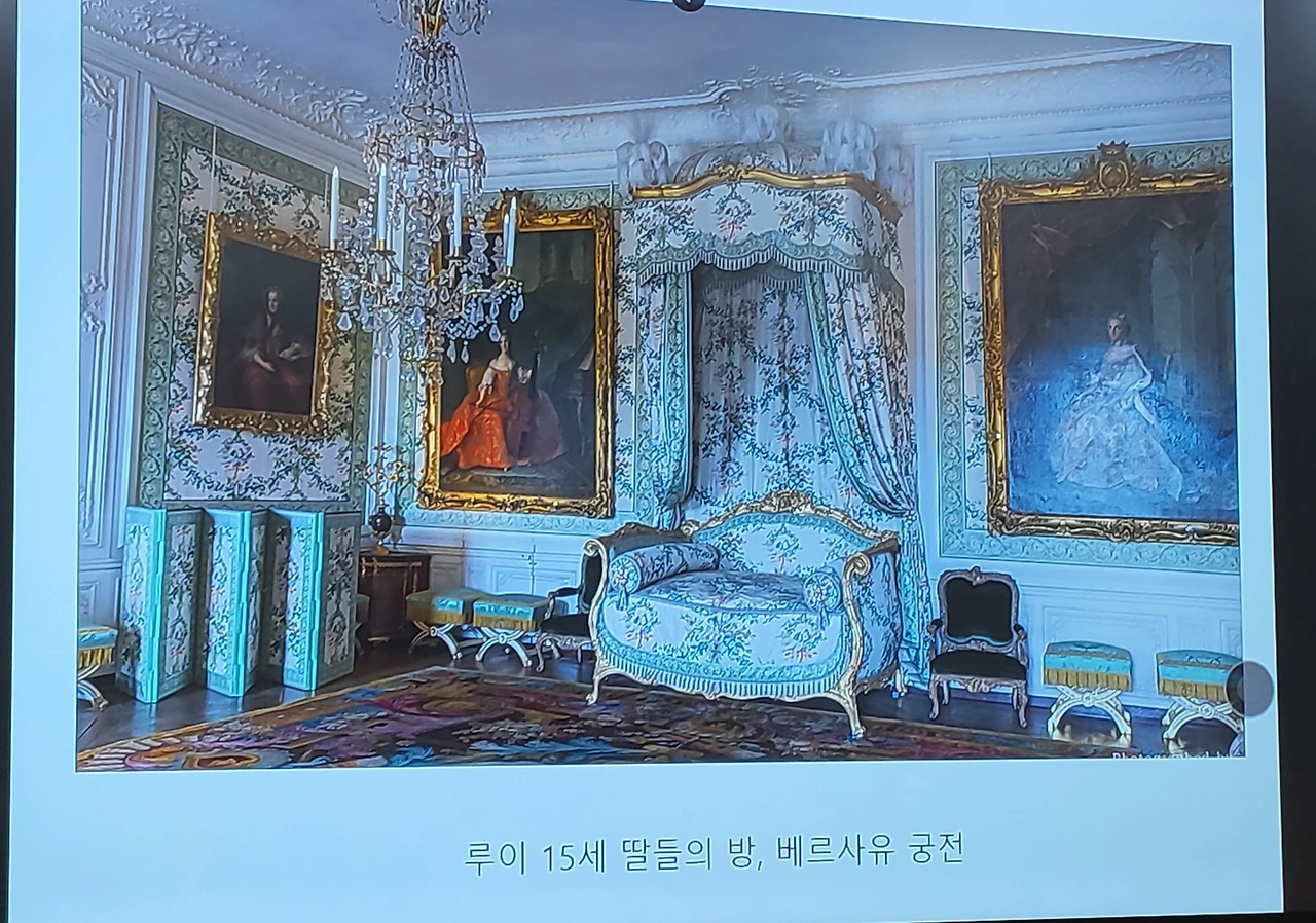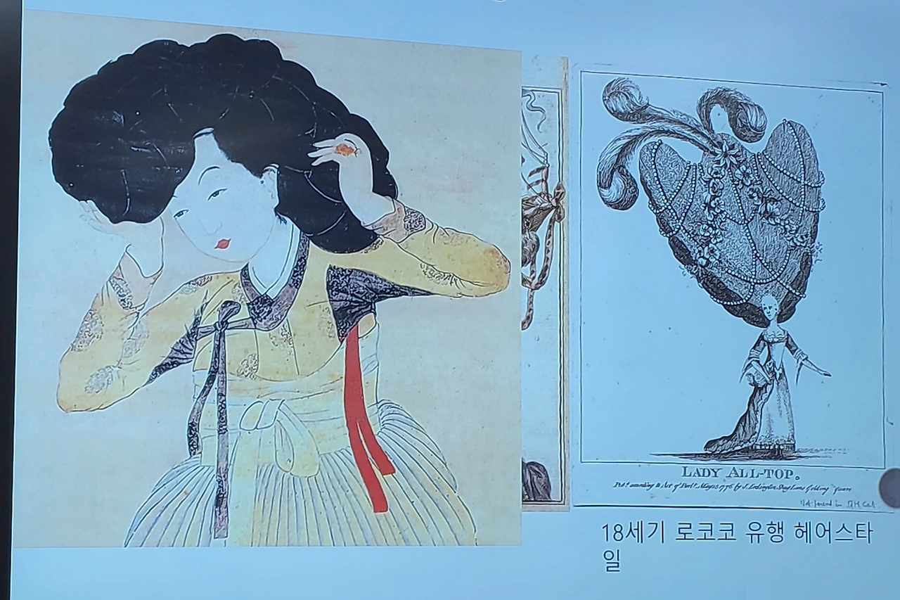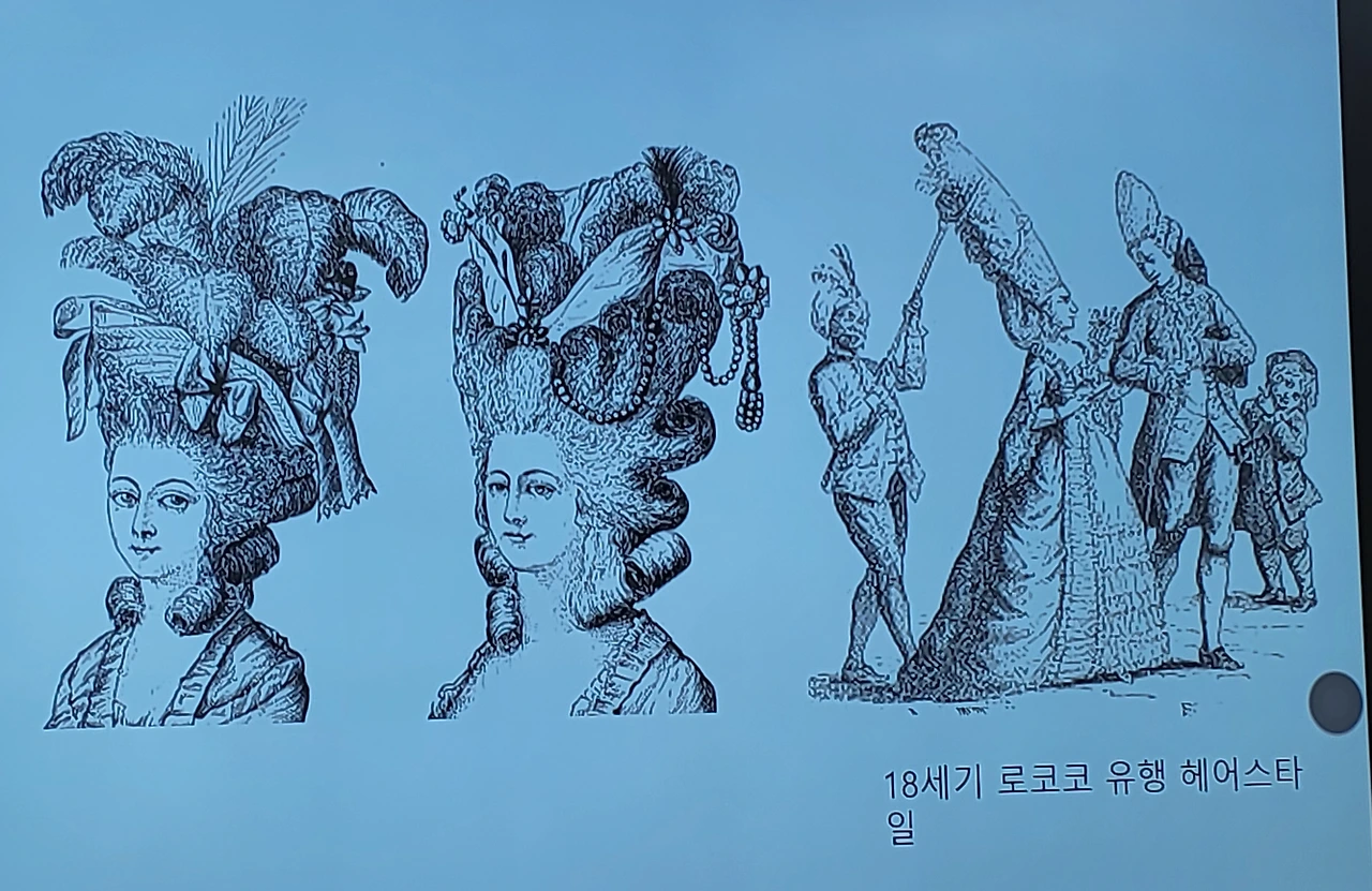 특별히 머리 스타일은 가히 과하다 싶을 정도다. 사진에서 하인이 떠받드는 장면이 있었다. 한국에서는 가채라고 해서 장식을 했다. 선생님 말씀으로는 목이 부러진 경우도 있다고 말씀해 주셨다.