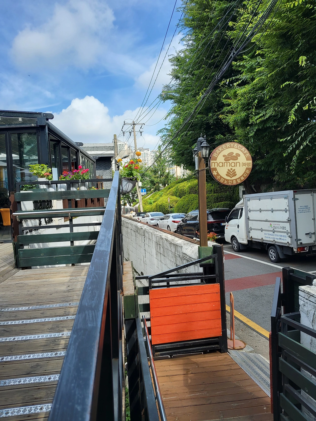 카네이션 마을이라는 푯말이 보인다. 노령층이 많은 곳으로 산성 사회 복지관이 역할을 해서 마망베이커리라는 카페가 크게 들어서있다.