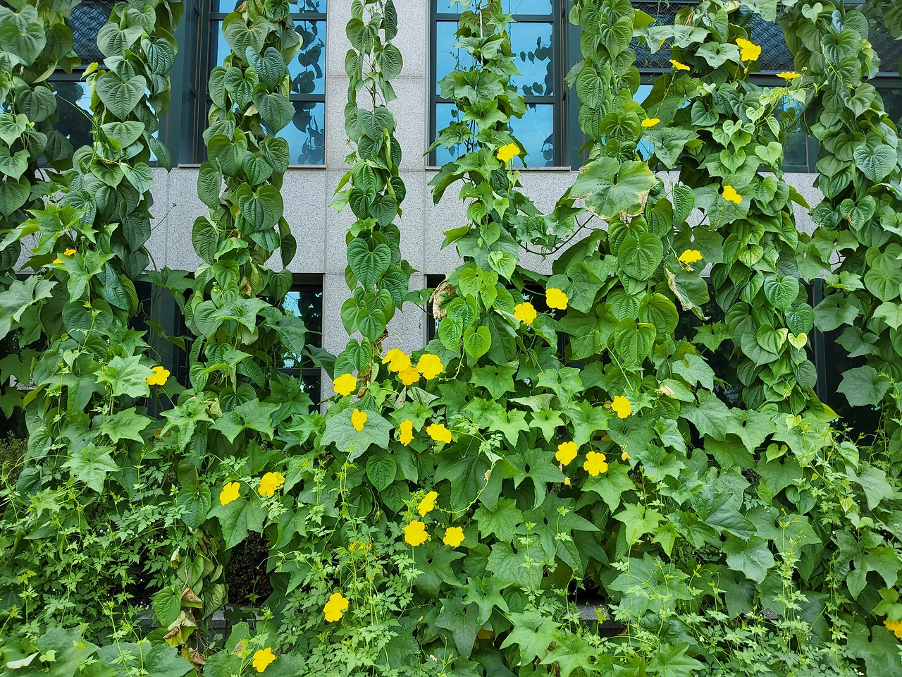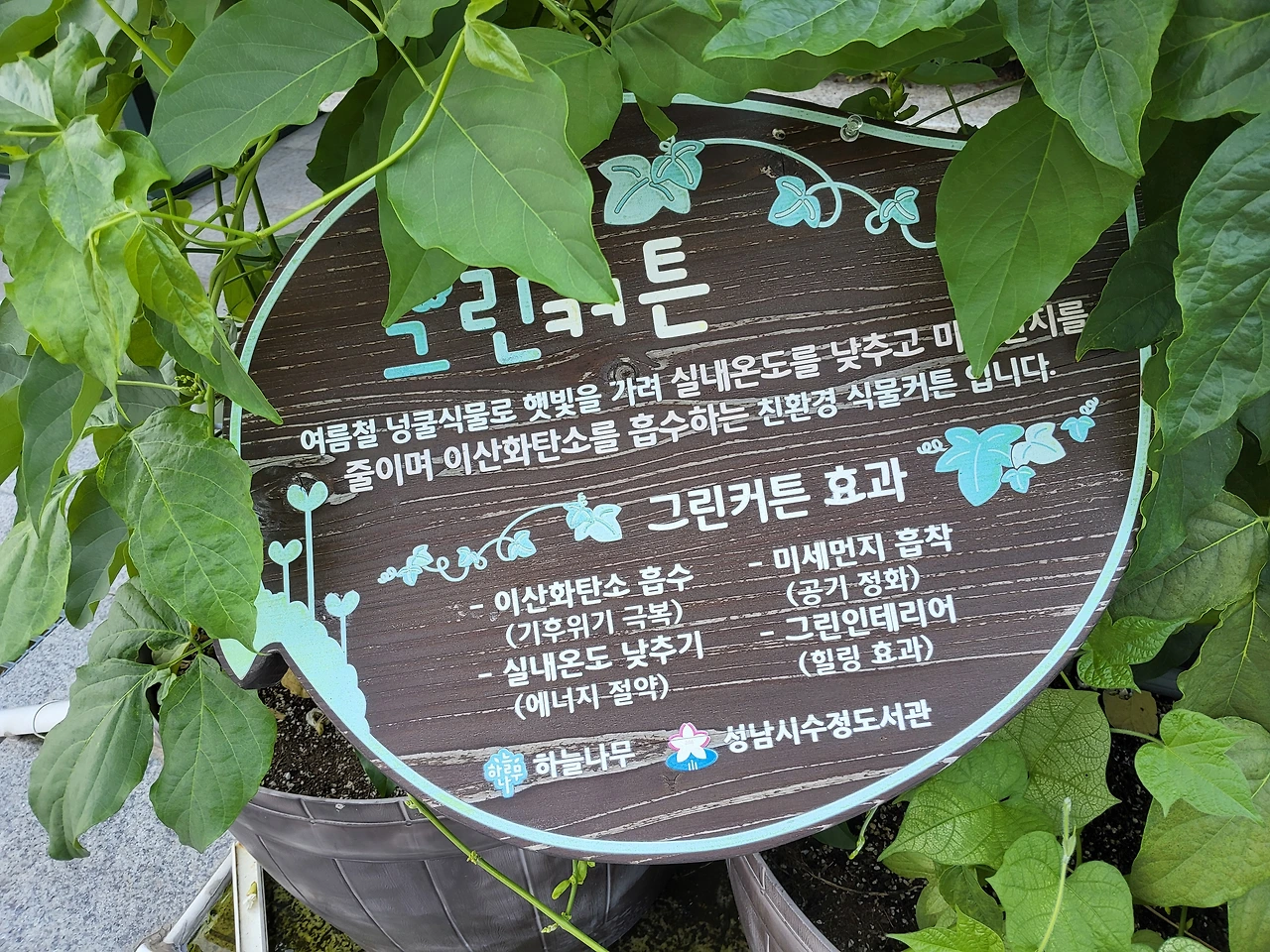 도서관 앞 긴 줄들 위에 노란 꽃들이 피어있다. 이름을 찾아보니 수세미 오이꽃이다. 그린커튼이라고 쓰여있다. 여름에 넝쿨식물로 햇빛을 가려 실내온도를 낮추고 미세 먼지를 줄이며, 이산화탄소를 흡수하는 친환경 식물 커튼이다.