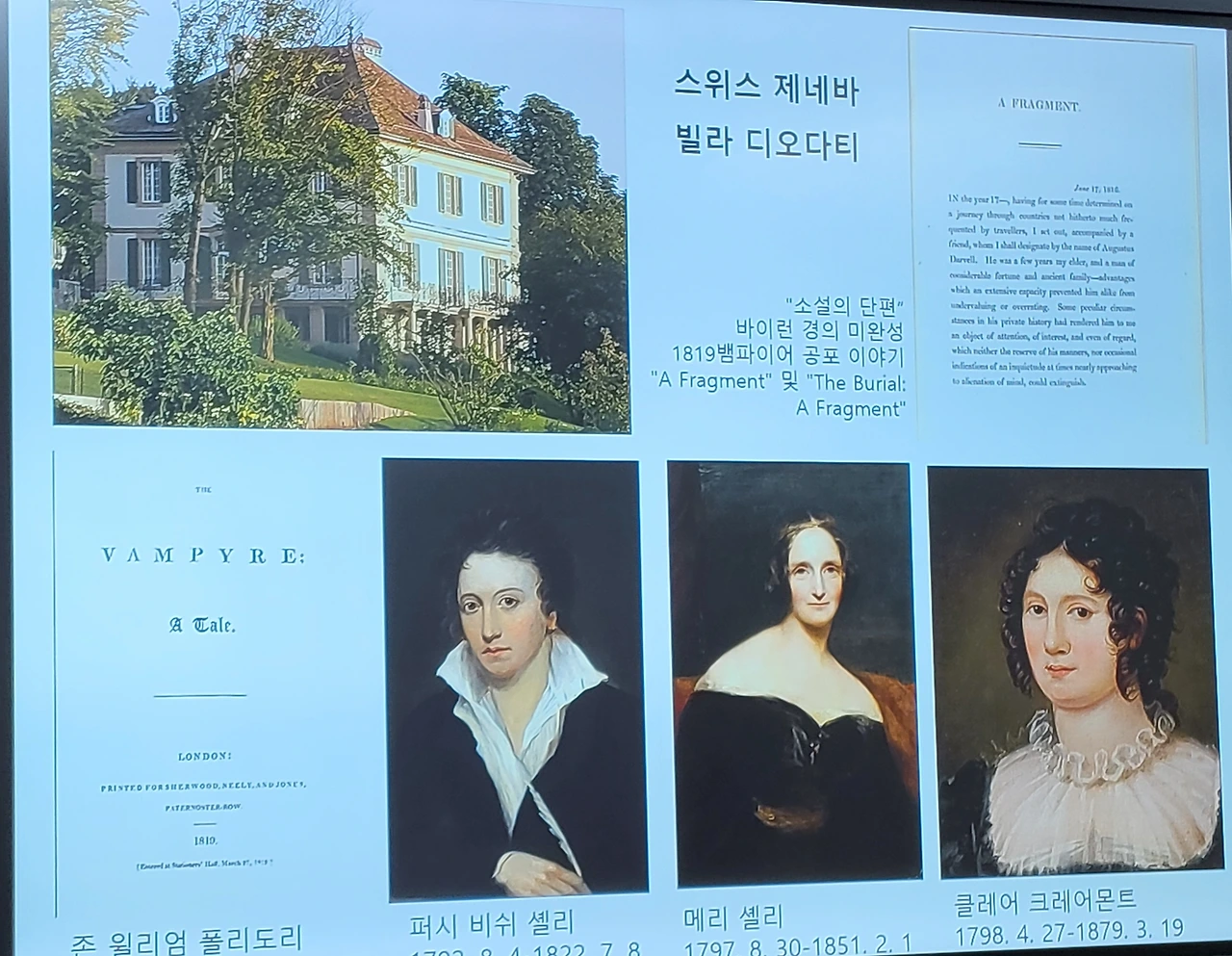 1816년 조지 고든 바이런 경은 영국의 3대 낭만파 시인이다. 잘 생기고 많은 스캔들을 몰고 다닌 인물이다. 별장인 스위스 레만호 호수의 저택에서 그의 주치의 존 윌리엄 폴리도리, 또 다른 낭만파 시인 퍼시 비쉬 셀리, 그의 아내 메리 셸리, 동생 클레어 클레어 몬트가 그곳에서 함께 지내게 되었다