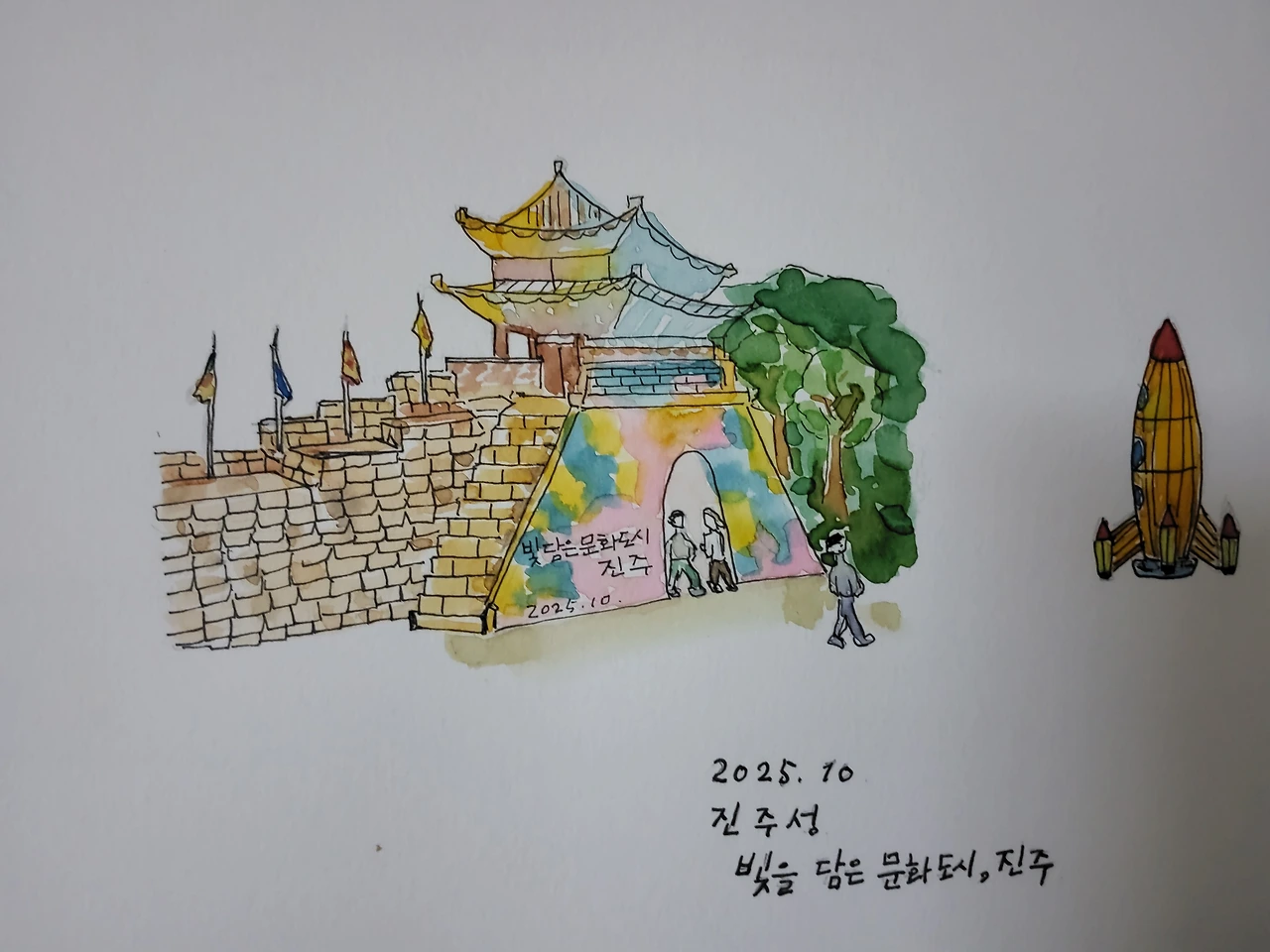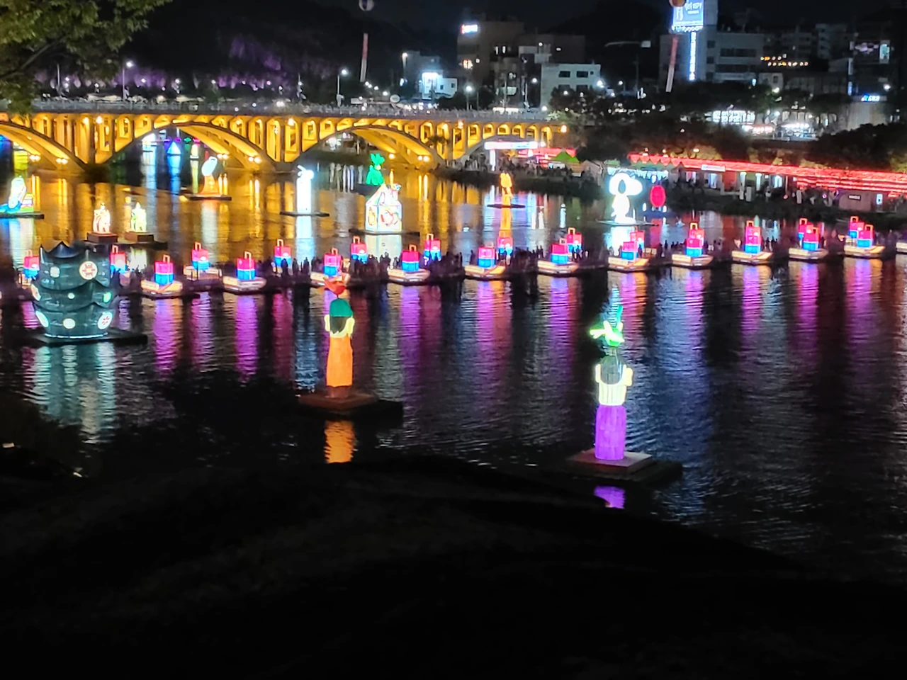 요즘 진주는 남강의 진주성을 따라 유등 축제가 펼쳐져 있다. 저녁에 가 보니 이렇게 인구밀도가 높았나 싶게 많은 인파로 들썩였다. 임진왜란의 승리와 패배가 머물러 있던 곳은 전래동화에 보는 토끼, 호랑이, 미래의 우주선의 여러 가지 모양이 넘쳐나 있었다. 남강위의 부포교는 티켓을 사가지고 들어갈 수 있었다.. 이제 시민들의 쉼터가 되는 자연 성곽의 모습이었다.