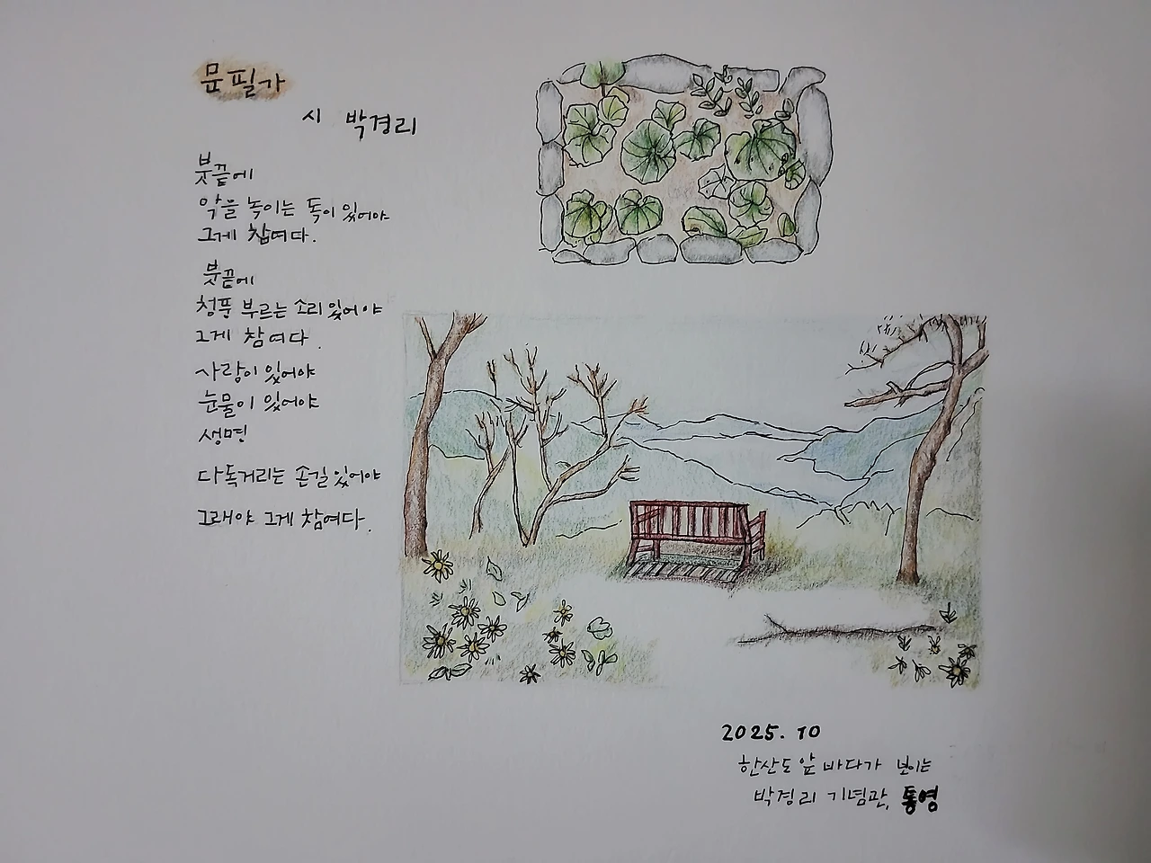 통영은 여러 문인들을 배출한 곳이다. 그중 박경리 작가님의 기념관이 있다. 지금 보수 중이고 2026년에 다시 개관한다고 한다. 추모공원은 들여다볼 수 있어 잠시 다녀왔다. 긴 '토지'는 아직 못 보고 '김 약국의 딸들'을 읽었었다. 그래서 시는 잘 몰랐는데 시가 줄이어 세워져있다.