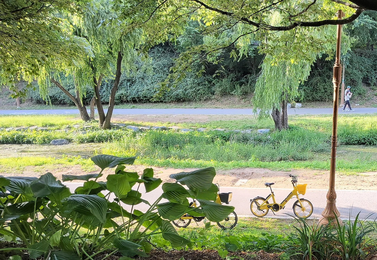 우리 동네의 언덕을 끼는 산길과 탄천을 가는 두 개의 길이 있다.