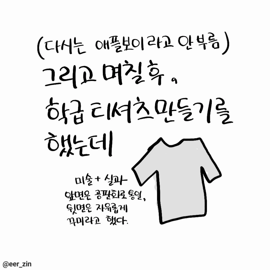 며칠이 더 흘렀을까요. 아이들과 실과, 미술 통합으로 티셔츠 만들기 수업을 했던 날입니다.
