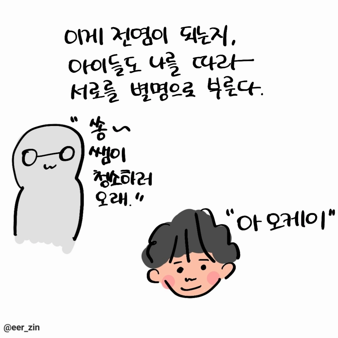 몇 번 마음대로 부르다보면 입에 익어서, 습관적으로 별명을 부르게 됩니다. 제가 하면, 아이들도 따라하고, 그렇게 그 아이는 1년 내내 별명으로 불리우게 되는..불가항력적인 일이랄까요.
