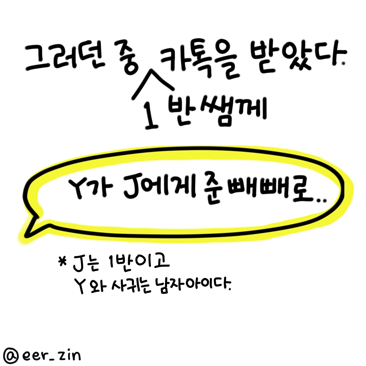 1반 선생님꼐 카톡 사진 한 장이 전송되었습니다. 사진에는 Y가 남자친구 J(1반)에게 선물한 빼빼로 사진이 담겨있었죠.
