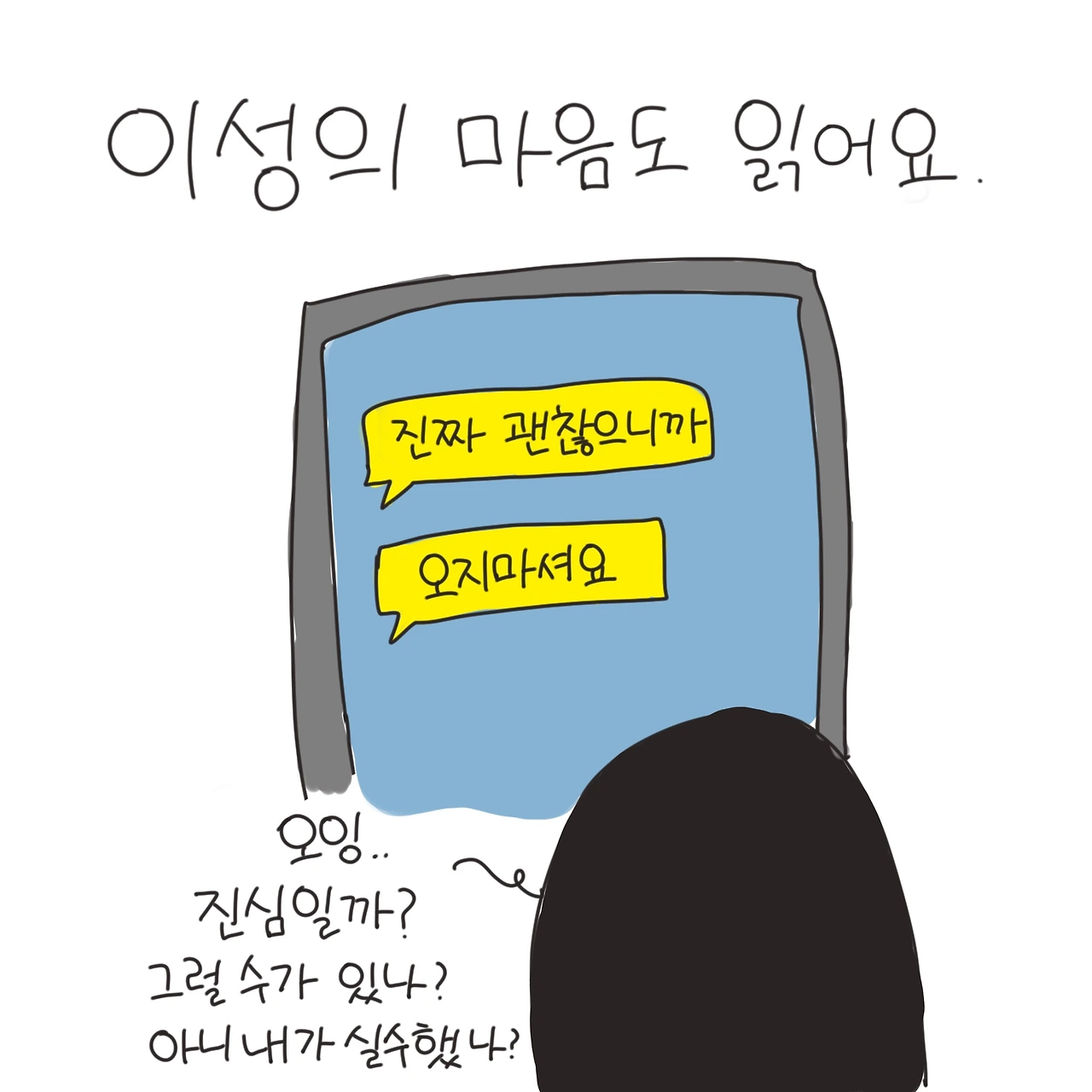 사람 마음도 읽어요. 직업이 직업인지라 학생들이 지금 수업에 집중하고 있는지, 요즘 소외되고 있는 친구는 없는지, 감정 하나하나를 놓치지 않고 읽으려고 해요. 남자친구 마음도 읽습니다. 쉽지만은 않지만, 표현해주는 그대로를 믿고 이해하려고 노력하죠!