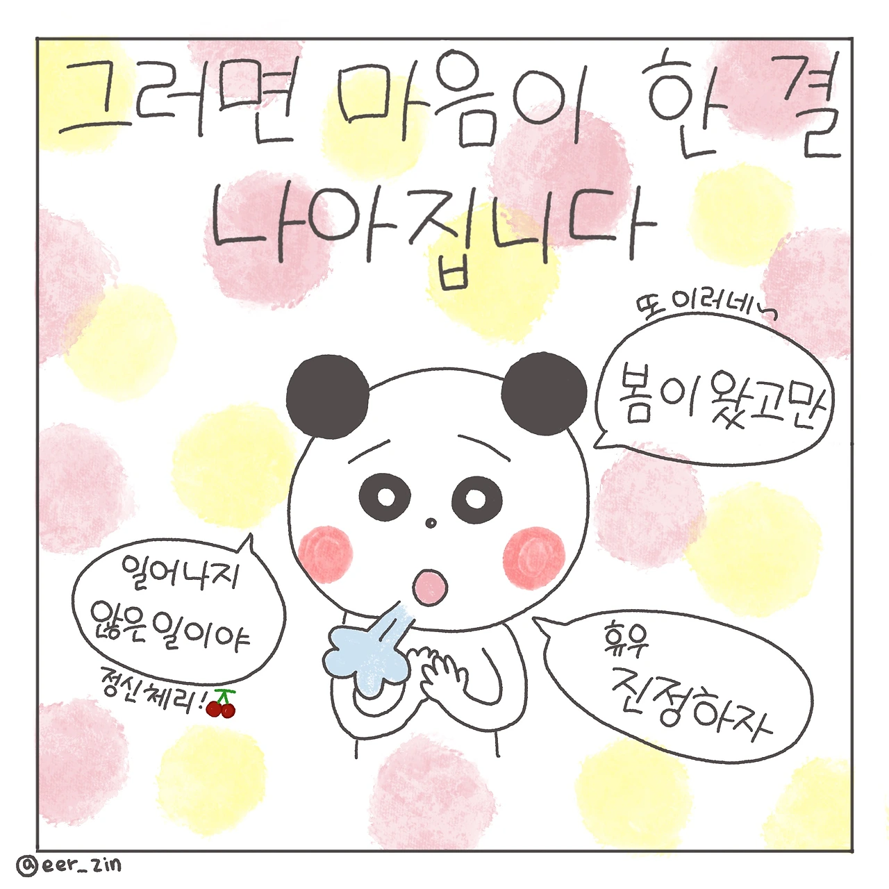 생각을 감시하면 그 생각의 뿌리를 알 수 있고 그러면 마음이 좀 편해져요. 봄이 와서 그렇구나? 나는 원래 불안 농도가 짙은 사람이니까. 일어나지도 않은 일이야. 진정하자. 하는 식입니다. 그리고는 4초간 숨을 들이 마시고, 8초간 숨을 내쉬어요. 그러면 마음이 한결 더 나아집니다.