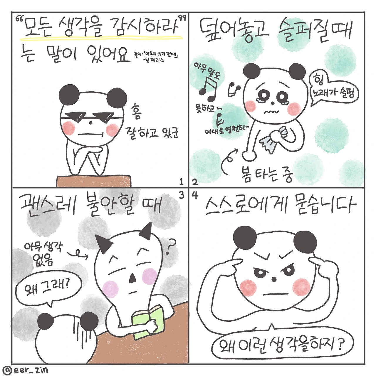 이렇게 하면 브레이크 없이 뻗어나가는 생각들에 제동을 걸 수 있습니다. 생각이 생각이 되지 않도록 막을 수 있고 생각이 사실이 되지 않도록 멈출 수 있습니다.