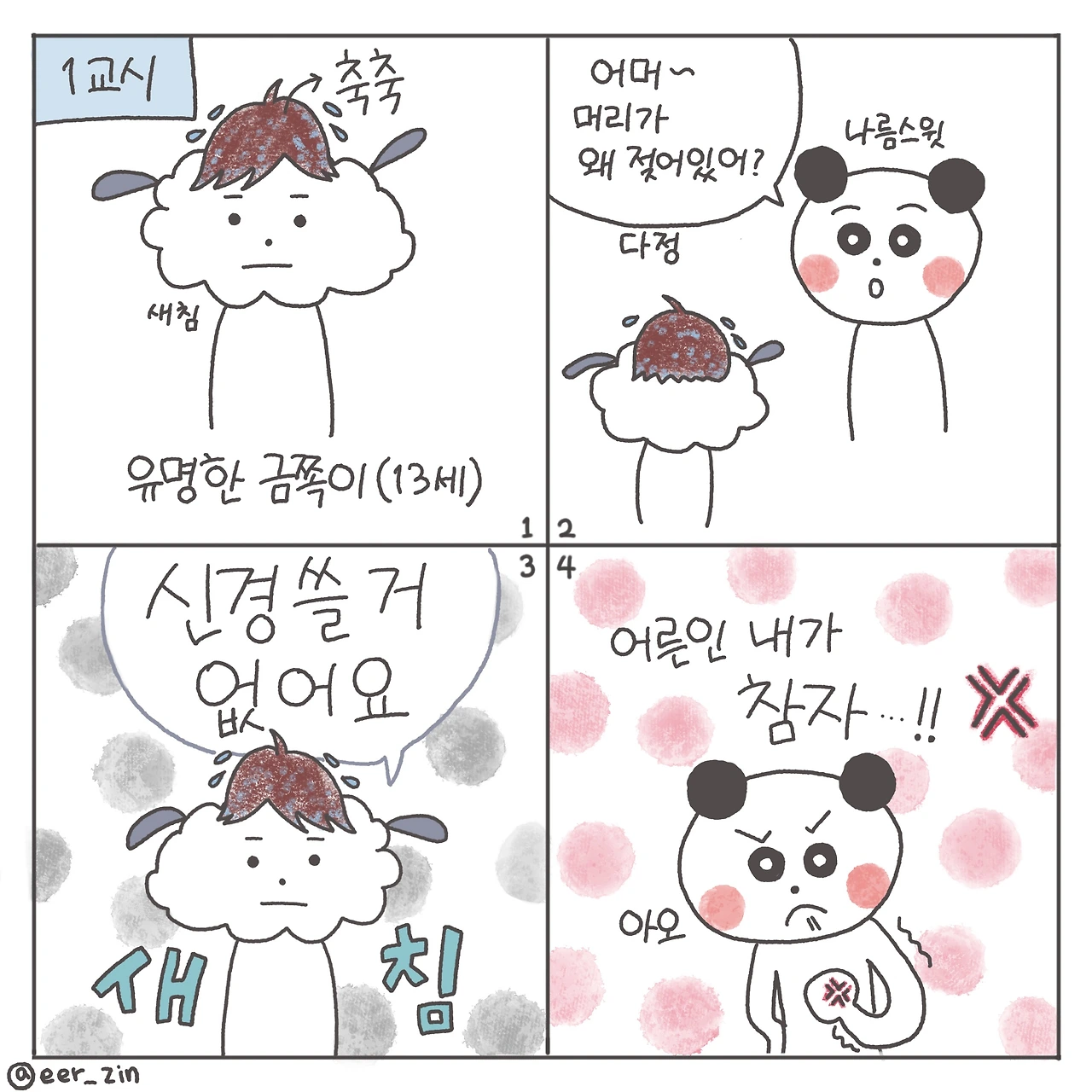 벚꽃이 잔뜩 핀 4월의 어느 아침이었습니다. 은결이가 축축하게 젖은 머리로 등교를 했습니다. 평소와는 다르게 말이죠. 사실 못 본 척 할 수 있었고, 또 그것이 바쁜 저에게 편한 일이지만, 스몰토크라도 하자는 마음에 다정히 물었습니다. 평소 제 말투에 스윗함을 두 스푼이나 더 넣어서 말이죠.