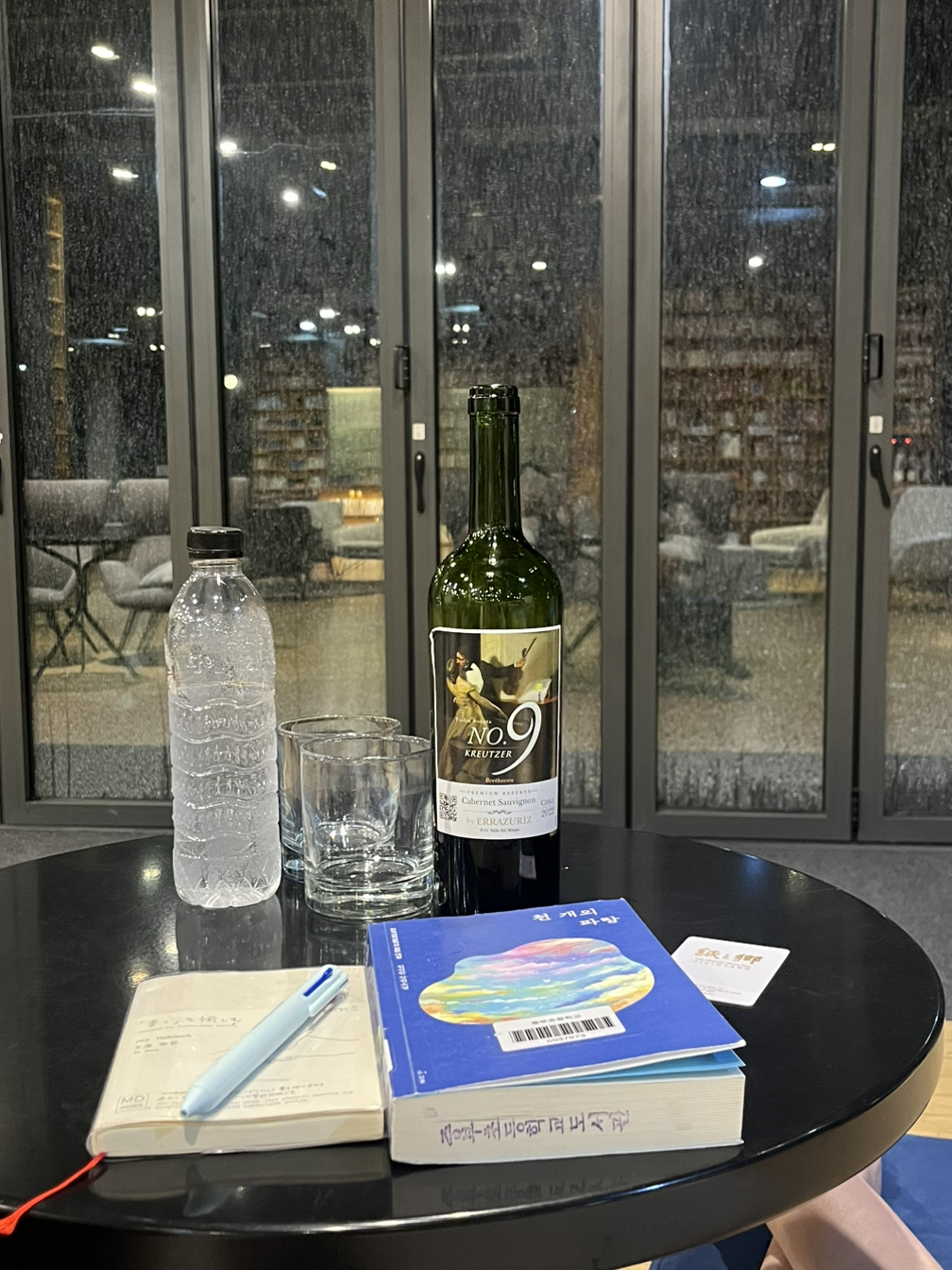 디오고의 와인 강연을 듣고 나오는 길이었다. 우리는 약속했던 대로 편의점에 들러 와인을 샀다. 검은색 양복을 입은 남자와 상아색 원피스를 입은 여자가 왈츠 같은 춤을 추고 있는 모습이 그려져 있는 와인이었다. 우리는 그걸 들고 애정하는 장소로 갔다. 욱이 서둘러 물 잔을 씻어 테이블에 올려놓고 오프너로 와인 코르크를 땄다. 그리고 내쪽에 있는 물 잔에 와인을 따라주었다. 블랙베리처럼 검붉은 색이 동그란 물 잔을 채웠다.