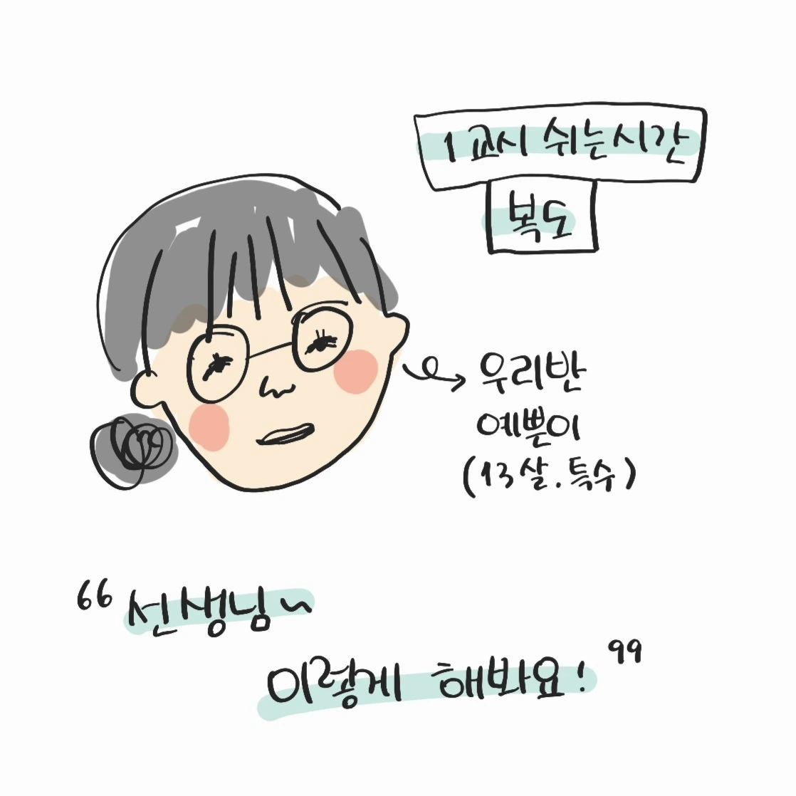 13살인데도 사춘기는 아직 멀었다 싶을 정도로, 예쁜 눈웃음을 지닌, 언제나 "선생님~"하며 작고 쓸모없는(?) 소품을 건네는 아이에요.