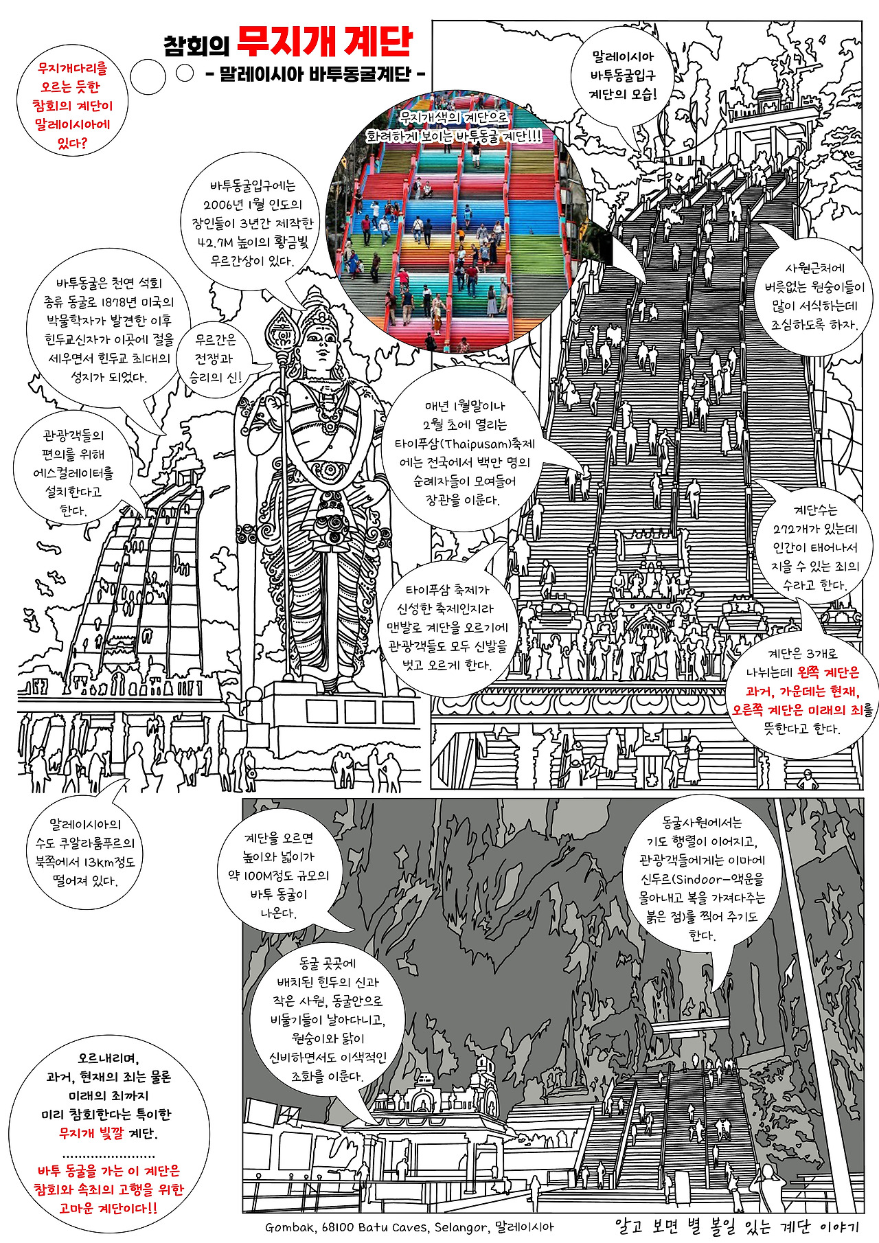 먼저 큰 황금빛 동상과, 그 뒤로 바투동굴로 이어지는 무지개 빛깔의 계단과,