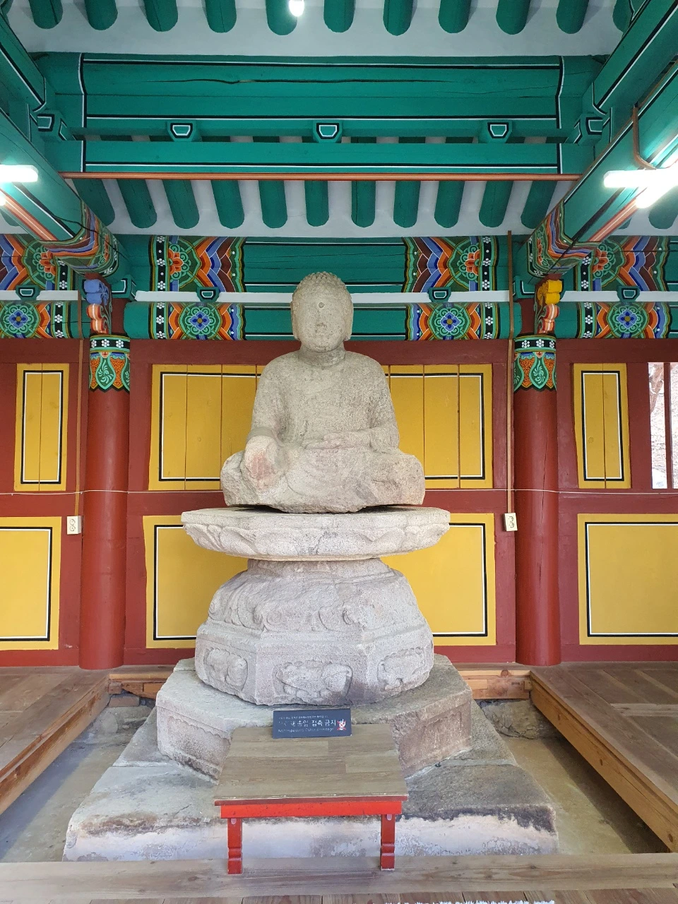 입구에 들어서자 아담한 법당과 언덕의 소나무가 우리를 반겼다. 천여 년의 세월이 흘러선지 소나무가 무성한 곳은 동산 형태가 돼 있었다. 찬바람에 솔잎이 파란을 일으키며 떨었다. 내 몸도 따라 추위를 느꼈다. 법당 안에 보물 제370호인 석조여래좌상이 눈길을 사로잡았다. 울산지역에서 보물로 지정된 유일한 불상으로 받침인 대좌의 일부와 원광인 광배가 없어졌으나, 전체의 형태는 잘 남아 있는 편이다. 불상을 모셔둔 대좌는 삼단으로 되어 있는데, 연꽃무늬가 새겨져 있고 화려하다. 통일신라 말기 불상의 양식적 특징을 보여준다. 손이 일부 잘려 나가 훼손돼 있었고, 목은 떨어져 나간 것을 수리·복원했다. 부처님이 앉은 좌대는 복원한 것이라 단의 색상이 달랐다. 긴 세월을 지나면서 소실되거나 원형이 훼손된 부분이 있어 안타까움을 더했다. 복원돼 보물로 지정됐으니 그나마 다행이다.