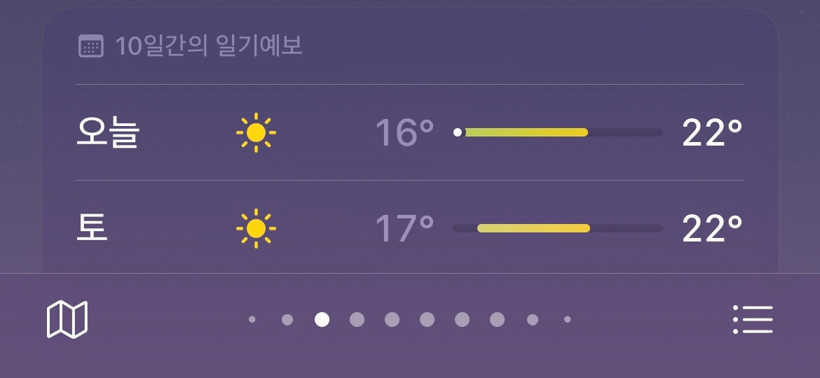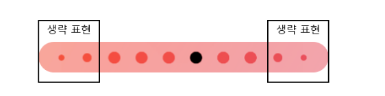 깔끔하고 똑똑한 방식을 하나 소개할게요. 위 이미지는 아이폰 날씨 앱에서 사용하는 점 인디케이터입니다. 양 쪽에 점이 서서히 작아지면서 생략 표현된 것이 보이나요?