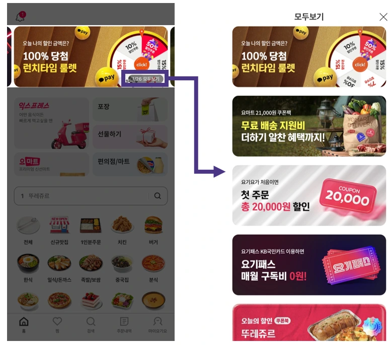 일반적으로 배너 이미지를 터치하면 해당 이벤트 페이지로 넘어갑니다. 작은 배너 안에 모든 내용을 담기는 어렵습니다. 그래서 좀 더 상세한 설명을 풀어낼 수 있는 별도 화면 뎁스를 추가하죠. 가령, 추첨 이벤트를 한다고 하면 추첨/응모 방식을 설명하는 페이지로 넘어간 뒤에 직접 응모할 수 있는 버튼이 제공됩니다. 배너만 보고는 구체적으로 어떤 이벤트인지 알 수 없으니 1단계를 더 두는거죠.