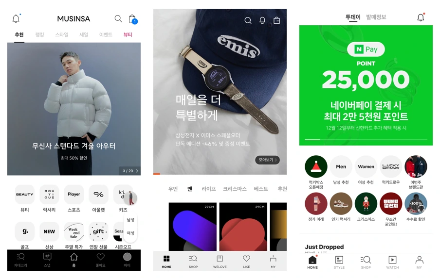 좀 더 감성적인 브랜딩이 필요한 쇼핑몰 앱에서 자주 사용하는 스타일입니다. 메인 화면에 진입하자마자 사용자의 눈을 사로 잡도록 널찍한 가로-세로 크기로 배치됩니다. 배너를 정사각형 또는 직사각형의 히어로 이미지로 제작하며 웹 환경에서도 자주 채택되는 형태입니다. 화면을 크게 차지하지만 아래로 스크롤하면 금새 사라지니 앱의 메인 기능에 크게 방해되지 않습니다.