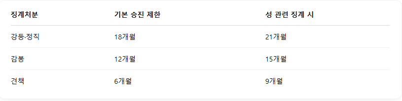▶ 징계 후 승진 제한 기간: 성폭력, 성희롱, 성매매 관련 징계는 기본 승진 제한 기간에 3개월 추가됨.