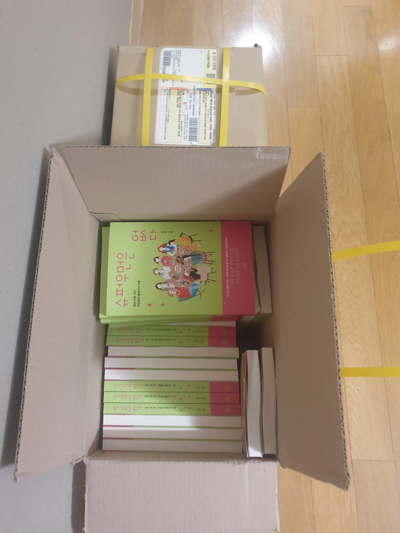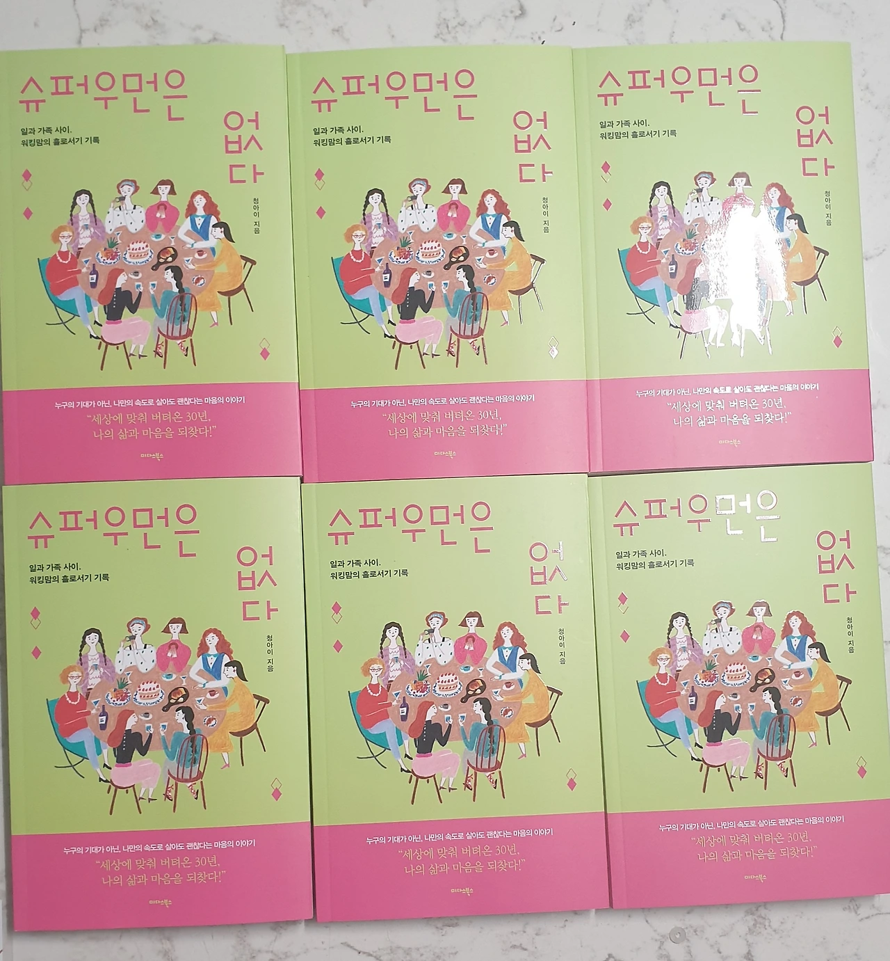 문을 열고 들어가니 남편의 검은 운동화가 보였다. 상자를 들여놓아 달라고 말했다. 남편은 말없이 상자를 옮겼다. 책은 거실로 들어왔다. 나는 그제야 상자를 풀었다. 책 한 권을 집어 들었다. 알록달록한 책 표지가 눈에 들어왔다. 내 이름이 찍힌 표지가 손에 닿았다. 책 여섯 권을 꺼내 식탁 위에 가지런히 놓고 사진을 찍었다. 작게나마 종이책이 나에게 온 걸 남기고 싶었다.