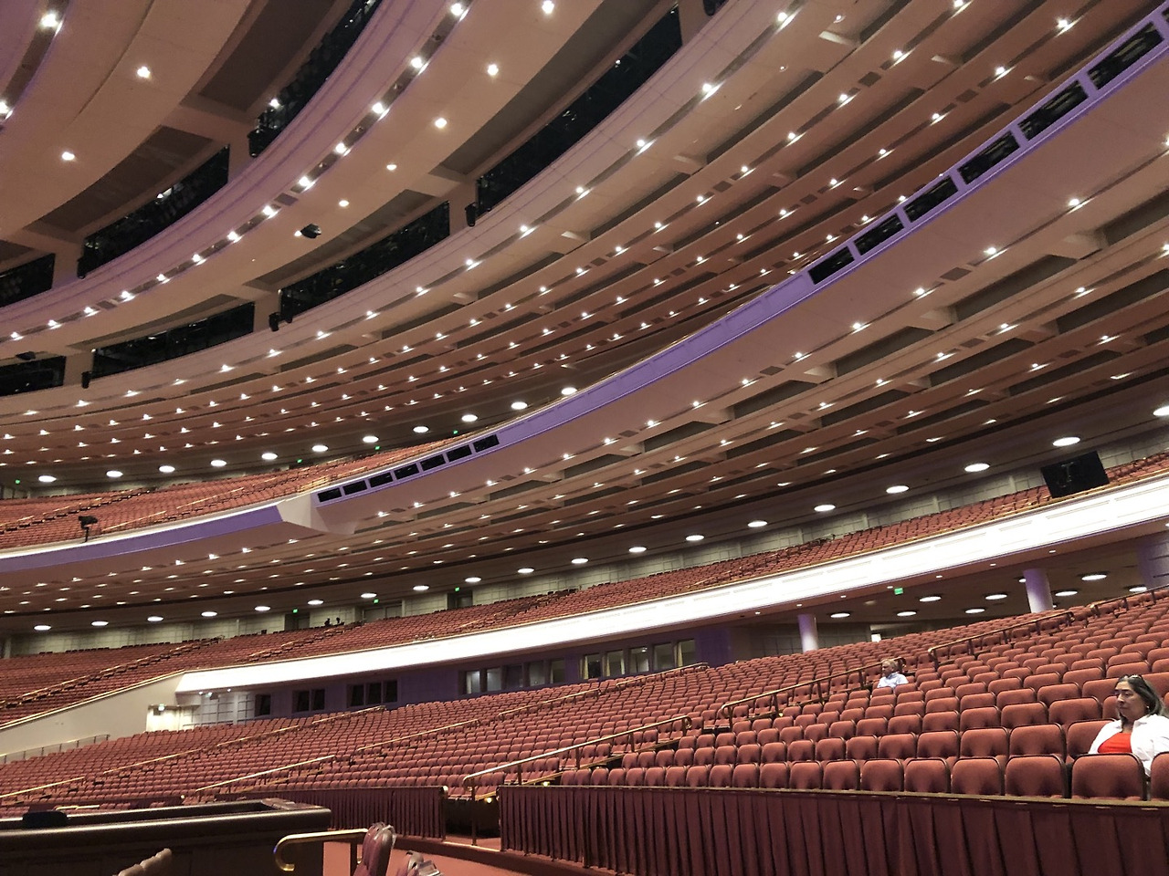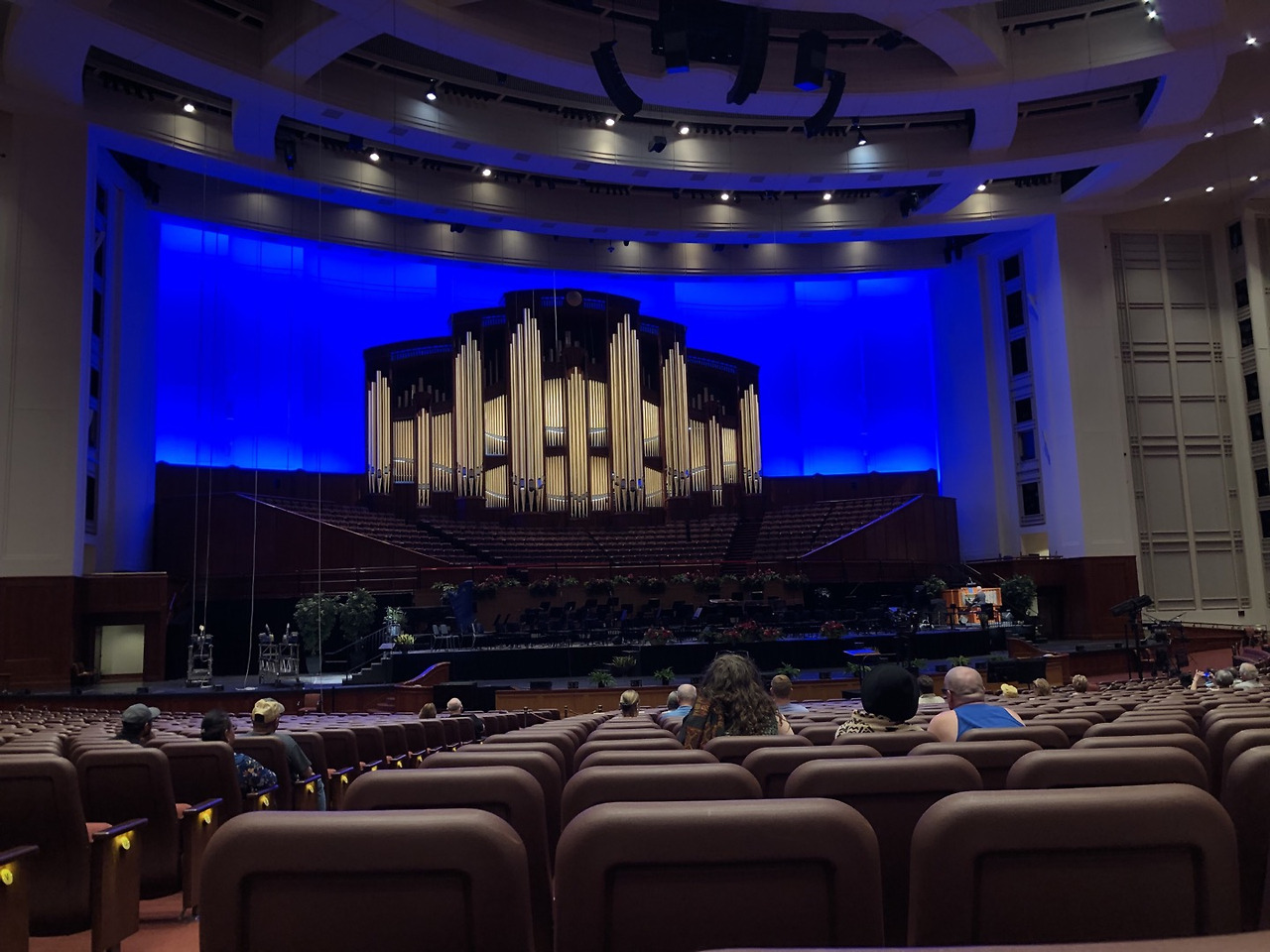 그들의 극장은 흔히 기독교의 예배당이 강단 전면에 내거는 예수의 십자가 상징이 없다. 그 자리를 차지하고 있는 것은 거대한 파이프 오르간이다. 이 극장에서는 오전에는 오르간 연주 연습이, 오후에는 유명한 몰몬 성전 합창단의 합창 연습이 이뤄지고 관강객들에게 개방되어 있다. 일 년에 두 번 공연이 있는데 전 세계에서 2만 명이 넘는 교인들이 모인다고 한다. 극장은 오르간 외에는 특별한 장식이 없고 소박하고 실용적이다. 그들의 가치관대로 본부의 건물도 검소하고, 화려한 장식이나 벽화로 치장되어 있는 기독교의 일반적 교회들과는 분위기가 다르다. 이들에게 유일한 장식은 꽃인 것 같았다. 몰몬교의 옛 극장은 천정이 돔 형태로 되어있는데 역시 이곳도 무대 전면에 거대한 파이프 오르간이 자리잡고 있다. 새 극장보다 오히려 파이프 수가 더 많다고 하고 지금도 작은 규모의 행사는 이곳에서 치룬다고 한다. 여기도 젊은 여성 선교사들이 두명 씩 짝을 지어 관광객들을 맞이하고 있다.
