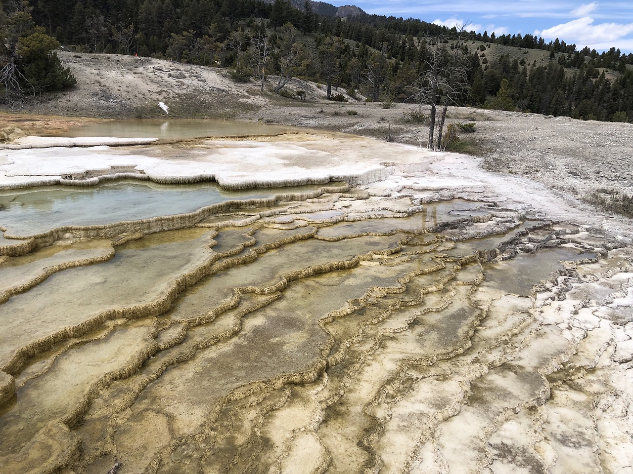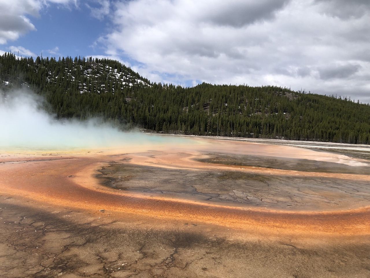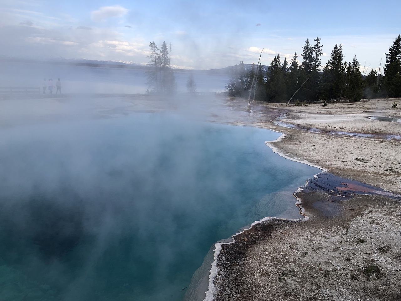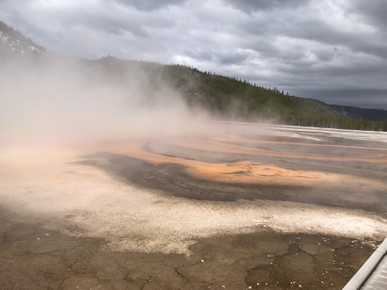 우리는 오늘 치의 사건.사고를 잘 해결하고(1일 1 해프닝이 우리가 정한 한계이다) 본격적인 구경길에 나섰다. 옐로스톤 둘레길(loop)들을 돌며 색깔 고운 물들이 솟아오르고 흘러내리며 만들어 낸 풀pool과 계단식 석회암 바위들을 구경했다. 분출되는 연기들이 너무 짙어 풀을 제대로 볼 수 없는 곳도 있고 마치 팔레트처럼 작은 여러 개의 풀 들이 옹기종기 모여있는 곳도 있다. 가장 유명하고 큰 가이저 풀은 그랜드 프리즈마틱 스프링Grand Prismatic Spring과 웨스트 썸West Thumb에서 볼 수 있다. 커다란 가이저geyser 와 작은 가스 물방울이 뽀글거리며 솟아올라 만들어진 다양한 색깔의 물웅덩이 둘레로 긴 보드워크길이 만들어져 있고 곳곳에 지정된 길 밖으로 나가면 위험하다는 경고문이 붙어있다.