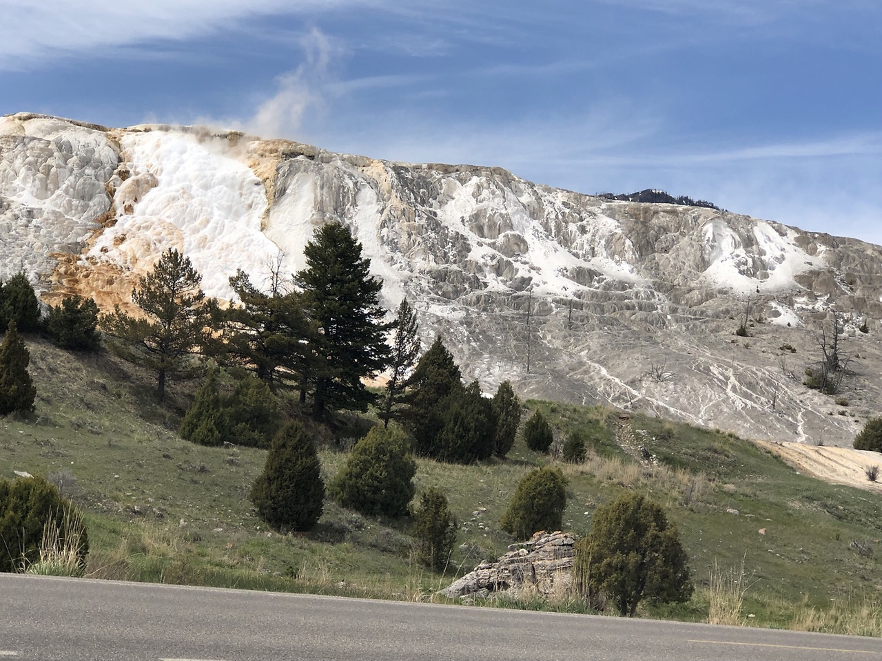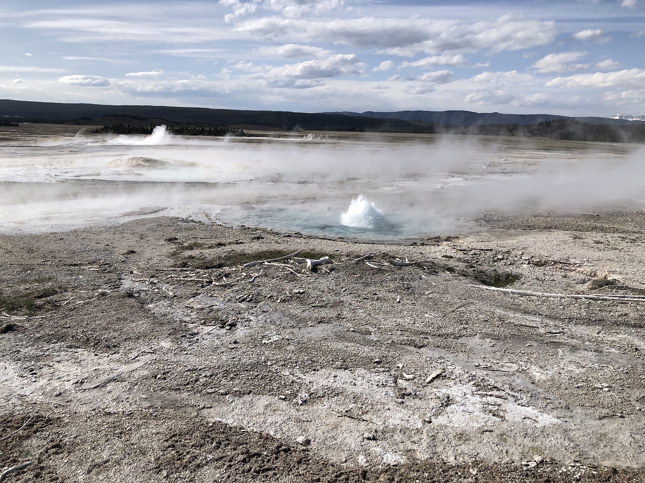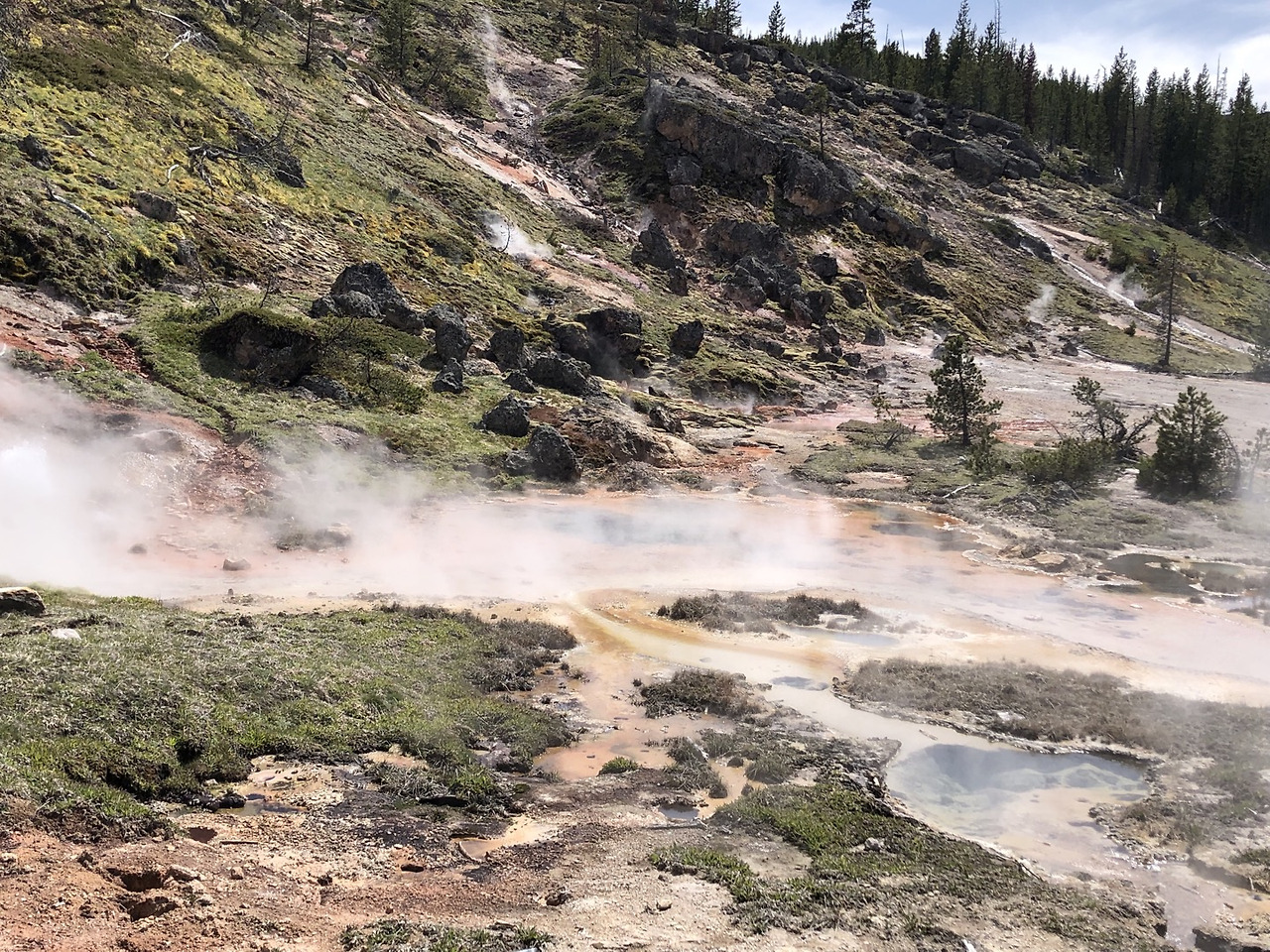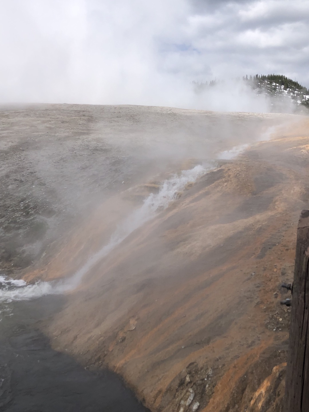 우리는 오늘 치의 사건.사고를 잘 해결하고(1일 1 해프닝이 우리가 정한 한계이다) 본격적인 구경길에 나섰다. 옐로스톤 둘레길(loop)들을 돌며 색깔 고운 물들이 솟아오르고 흘러내리며 만들어 낸 풀pool과 계단식 석회암 바위들을 구경했다. 분출되는 연기들이 너무 짙어 풀을 제대로 볼 수 없는 곳도 있고 마치 팔레트처럼 작은 여러 개의 풀 들이 옹기종기 모여있는 곳도 있다. 가장 유명하고 큰 가이저 풀은 그랜드 프리즈마틱 스프링Grand Prismatic Spring과 웨스트 썸West Thumb에서 볼 수 있다. 커다란 가이저geyser 와 작은 가스 물방울이 뽀글거리며 솟아올라 만들어진 다양한 색깔의 물웅덩이 둘레로 긴 보드워크길이 만들어져 있고 곳곳에 지정된 길 밖으로 나가면 위험하다는 경고문이 붙어있다.