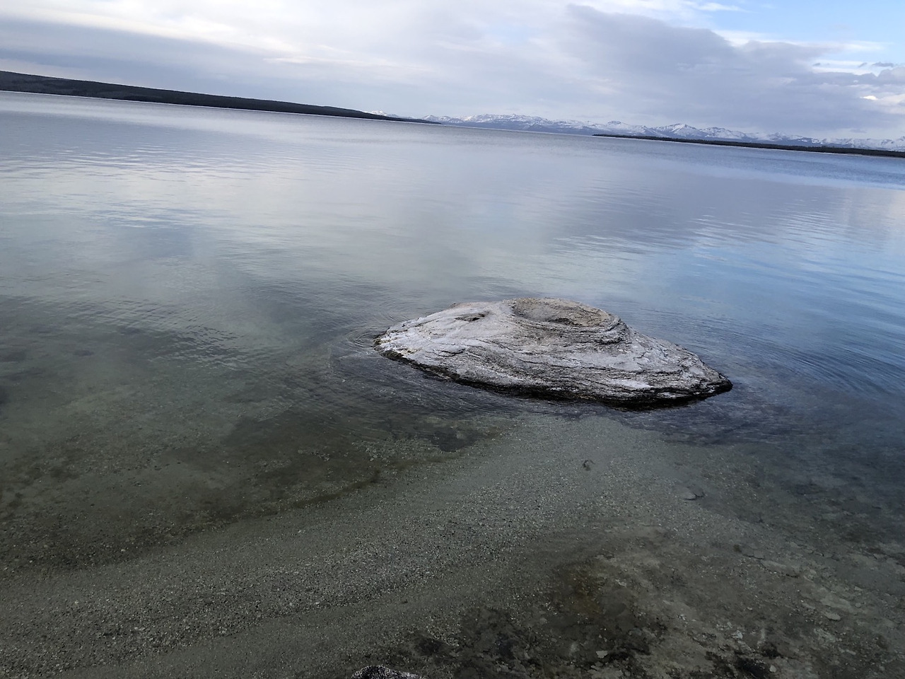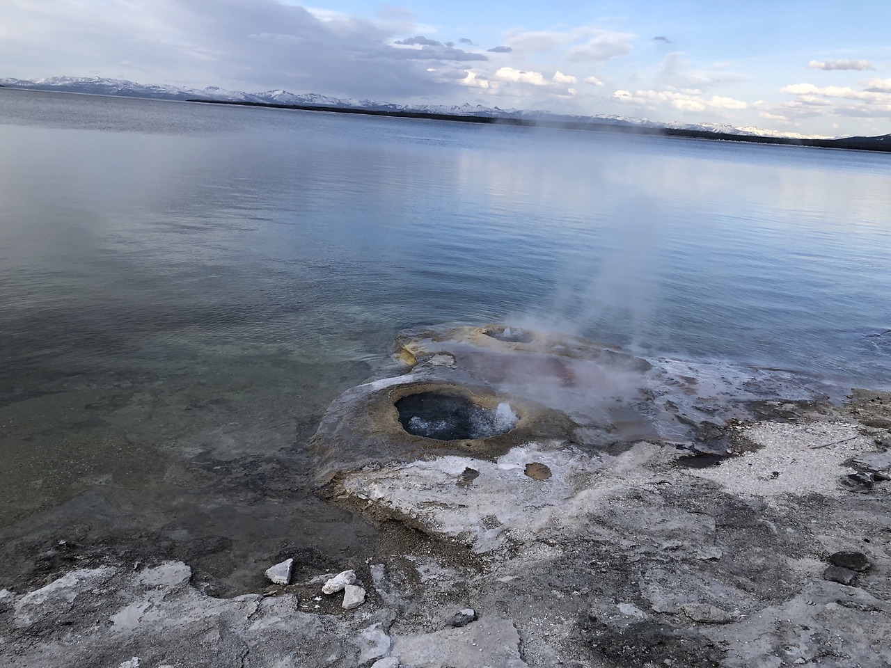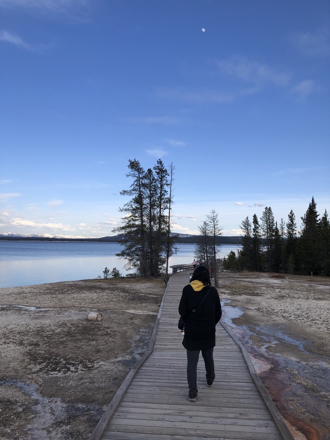 옐로스톤 공원 여기저기를 드라이브하는 동안 초원 곳곳에서 그리고 산비탈 곳곳에서 피어오르는 수많은 수증기들이 외계행성에 온 듯한 강렬한 충격을 받게 하지만 내가 가장 좋아했던 풍경은 웨스트 썸 근처 옐로스톤 호숫가 트레일을 걸으며 만난 풍경이다. 호숫가에는 크고 작은 웅덩이에서(웅덩이 마다 각각 이름이 붙어 있다) 가스들이 뽀글거리고, 숲과 하늘이 비친 투명한 호수는 바다같이 넓다. 서쪽 하늘에 구름인지 달인지, 얇은 솜털같은 하얀 반달이 그림처럼 걸려있다. 이틀 동안 경이로운 풍경에 흥분되고 들떠있던 마음이 조용히 가라앉았다. 이곳에 살았던 원주민들이 그들의 신과 가장 깊이 교감했던 것은 이런 시간, 이런 곳에서가 아니었을까. 놀라운 자연을 만들어 내고 지배하는 무시무시한 힘을 가진 존재라기보다 신비한 자연세계 속에서 생명을 꽃피게 하고 돌보고 영혼을 맑게하는 그런 존재로서 말이다.