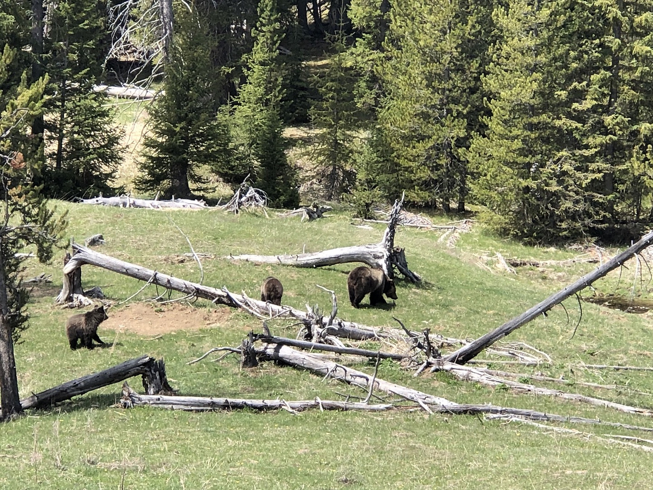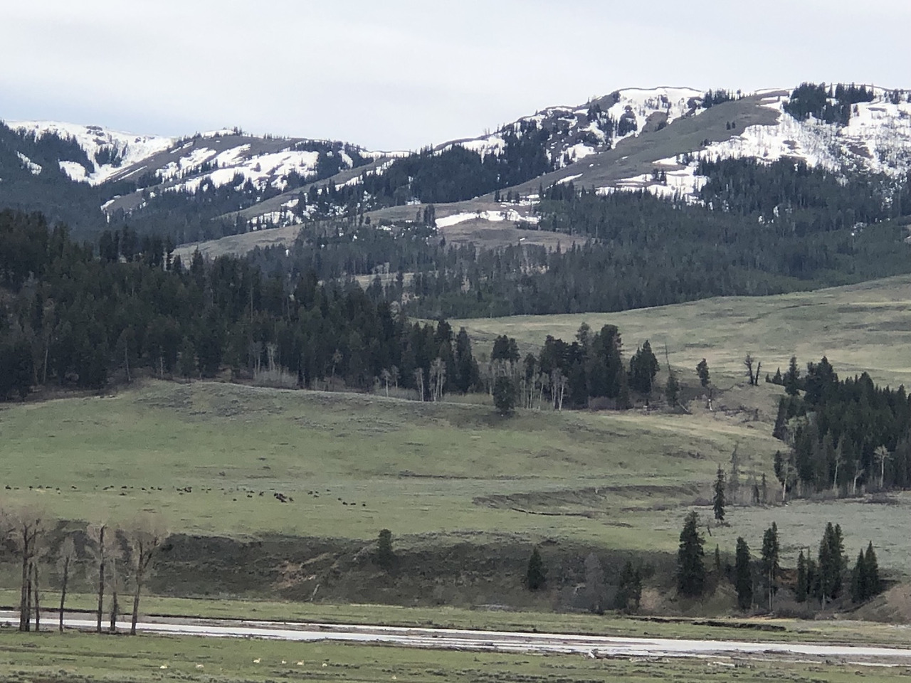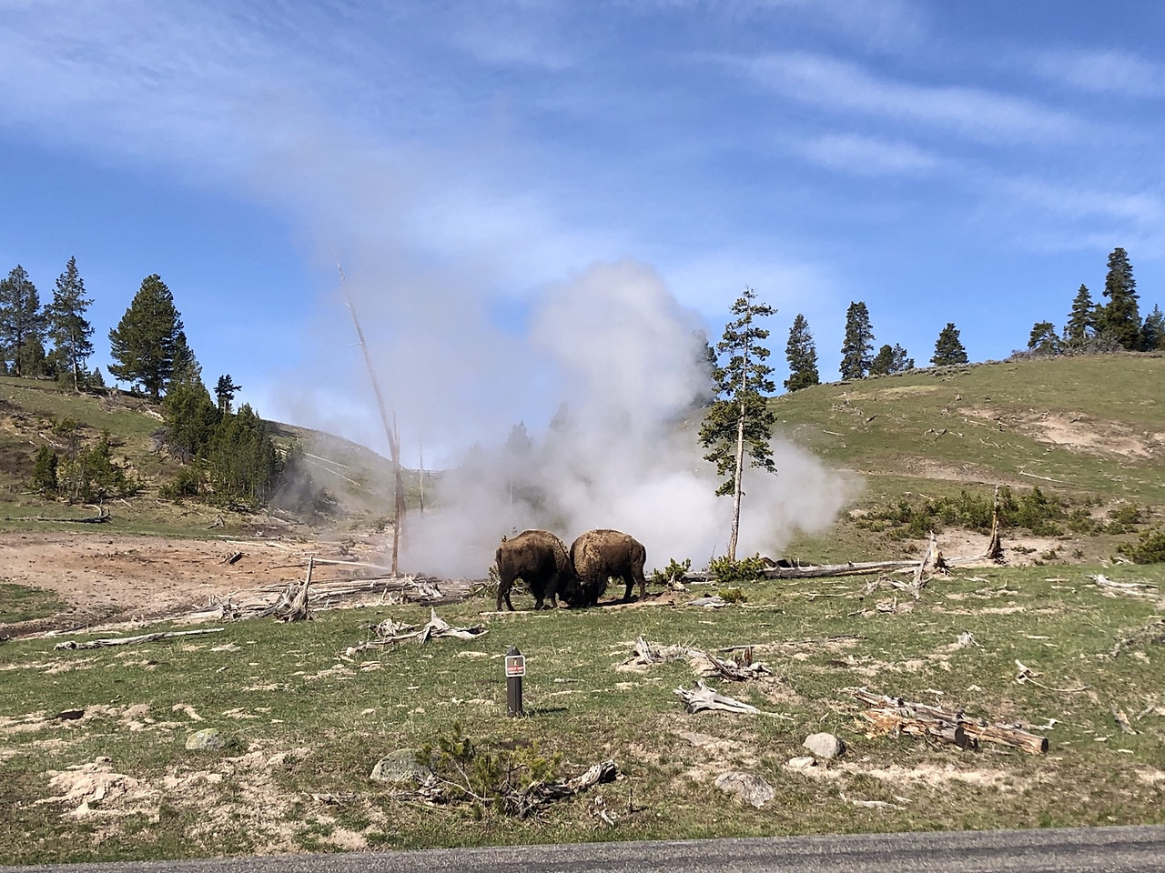 나무 울창한 숲을 지나가다 차들이 세워져 있고 사람들이 모여 있는 곳에는 어김없이 뭔가 동물들이 나타난 것이라고 보면 된다. 우리는 나무 위에 올라가 있는 새끼 곰과 그 밑을 어슬렁거리고 있는 어미 곰을 보기도 했고 새끼 두 마리를 거느린 어미 곰이 숲 속에서 배회하는 것도 보았다. 한 번은 길 한가운데서 세상 편하게 천천히 걷고 있는 들소 뒤를 따라 천천히 차를 움직여야 했다. 코요테도 보았다. 사슴도 흔하게 볼 수 있지만 무엇보다 제일 많이 눈에 띄는 건 역시 태평하게 무리 지어먹거나 쉬고 있는 초원의 들소 떼이다.